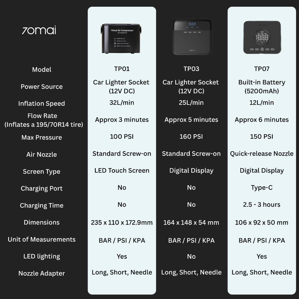 70mai Portable Air Compressor Tire Air Pump TP03 | Max 160 PSI | Smart Inflation | Quiet Operation | LED Display Screen