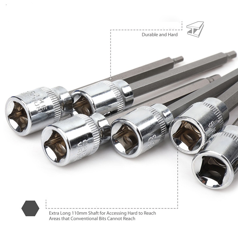 7pcs 3/8 Inch 110mm Long Hex Bit Socket Set Extra Long Allen Key Wrench Head Tool H Shape Nut Removing Bits