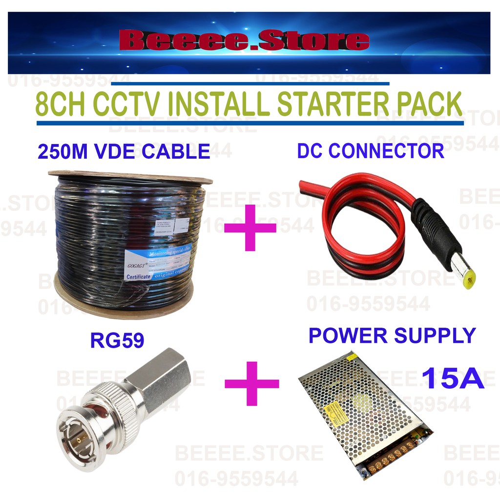 8CH CCTV INSTALL STARTER PACK ( 250 METER CABLE + DC CONNECTOR+RG59+POWER SUPPLY 15A ) CABLE CCTV 8ch Package