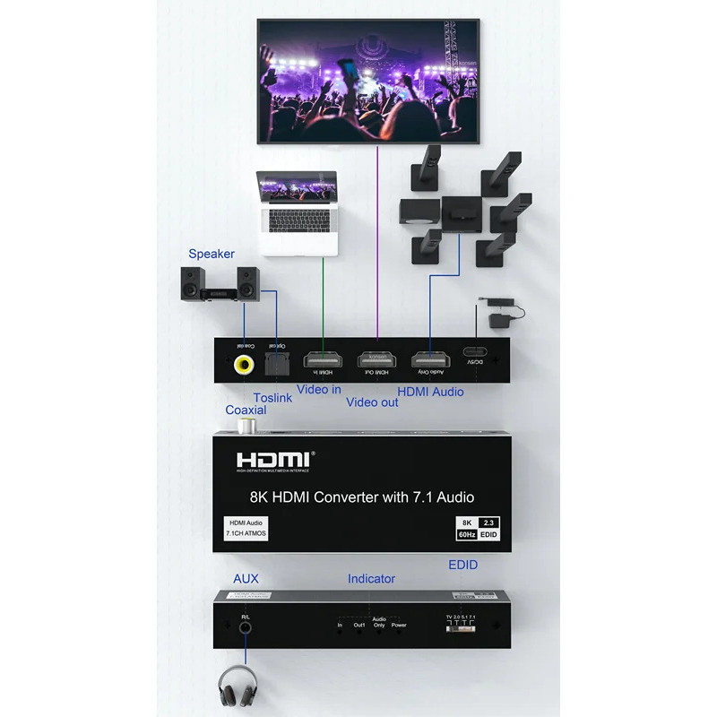 8K@60Hz 4K@120Hz HDMI 2.1 Audio Extractor Splitter with HDMI 7.1CH+Optical SPDIF/Coaxial 5.1CH+3.5mm Jack Audio Out HDCP 2.3 VRR