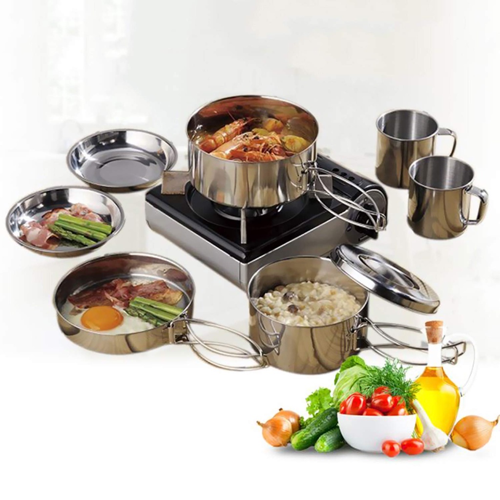 8pcs Camping Hiking Travel Cookware Bowl Portable Cooking Cookware Set Stainless Steel Periuk Masak pots Frying Pan Mug
