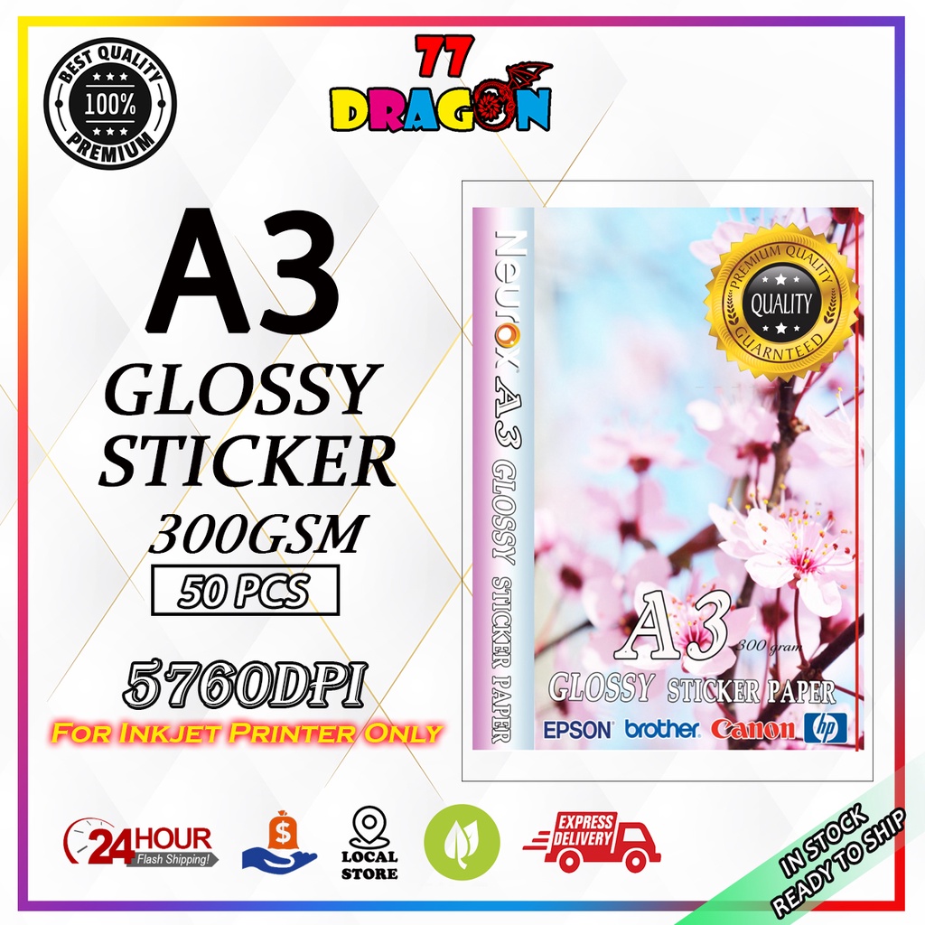 A3 GLOSSY STICKER PAPER 50PCS/PKT (300GSM) - BUY 10 PACKS FREE 4R Photo Paper