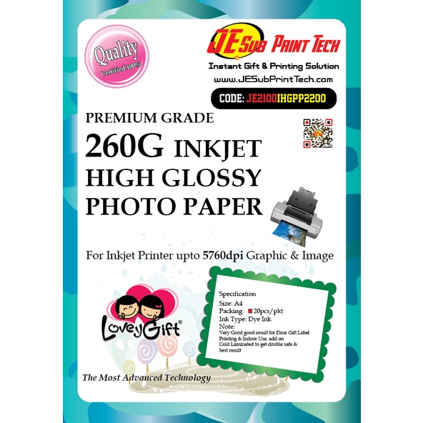 A4 Inkjet Premium High Glossy Photo Paper -260GSM (20pcs/pack )