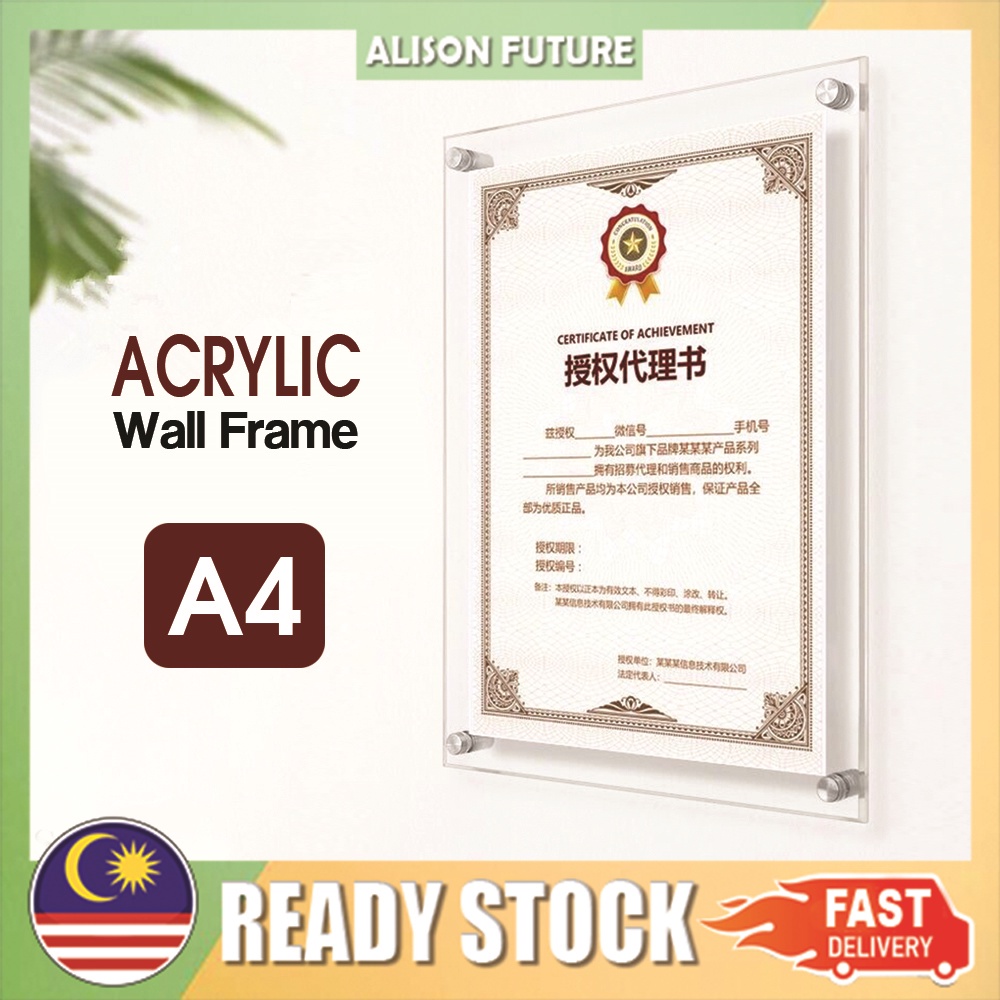 A4 Wall Mounted Clear Acrylic Paper Photo/Certificate Frame with Screw