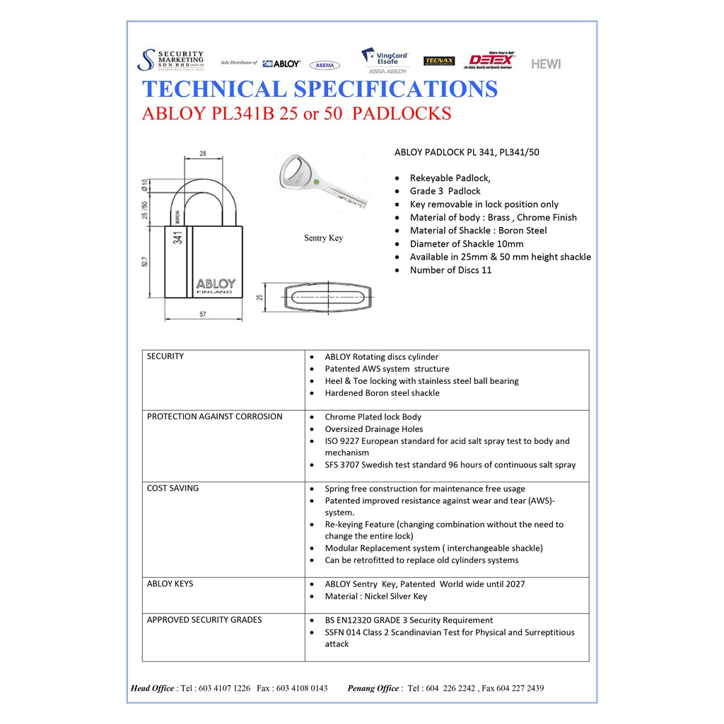 ABLOY PL341 BRASS PADLOCK IN SENTRY KEY (SHORT/LONG SHACKLE)