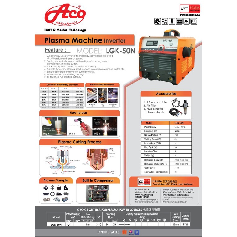 ACO-C50N CUT-LGK50N ACO PLASMA CUT MACHINE (COMPRESSOR LESS) FREE: SG55 PLASMA TORCH & EARTH CLAMP