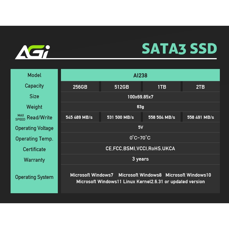 AGI AI238 256G/512G/1TB 2.5 < SATA SSD Solid State Drive (Read Write 550/500MBs)