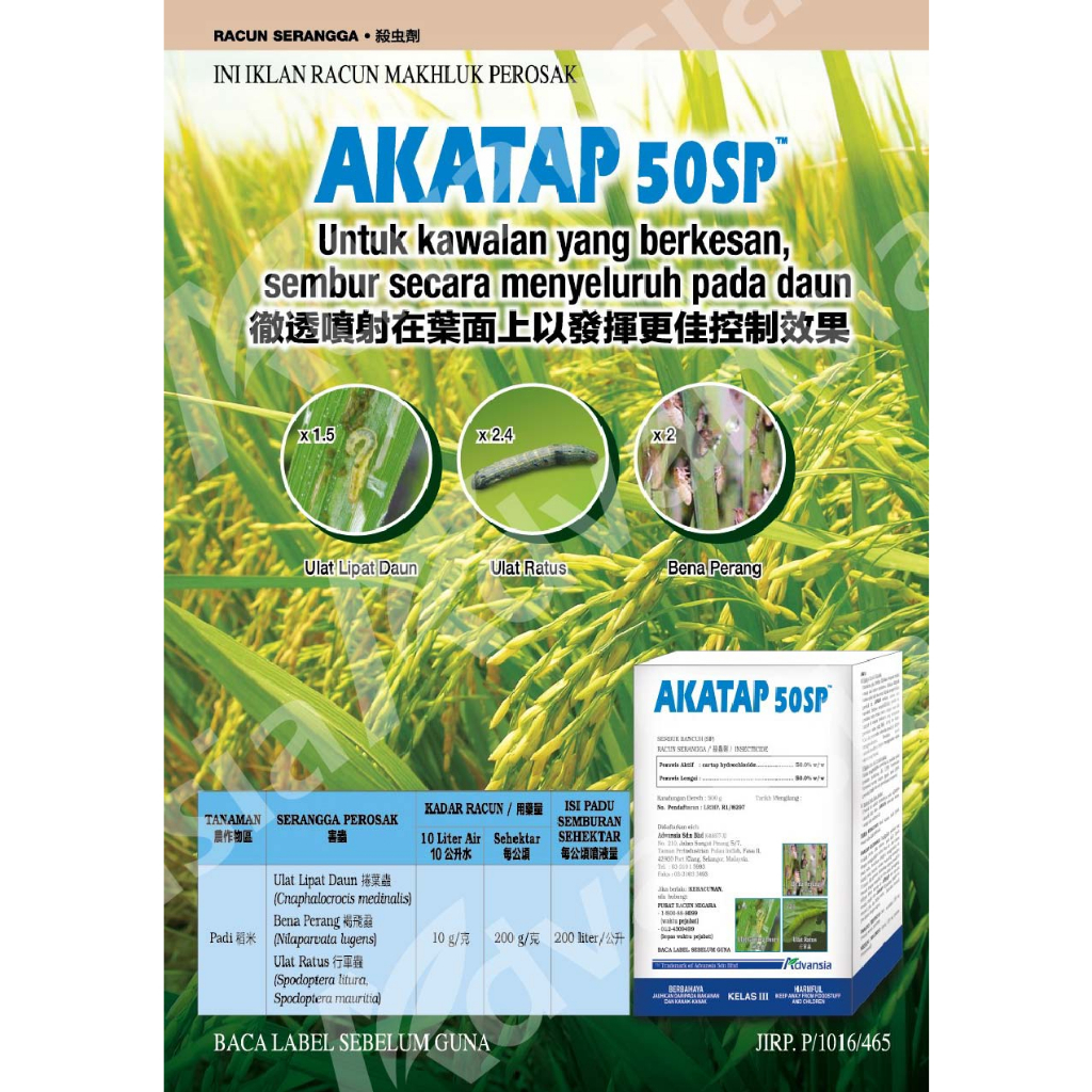 AKATAP 50SP/ Racun Serangga/ cartap hydrochloride 50.0% w/w/ Ulat Plutella/ Kutu Daun/ Ulat Ratus