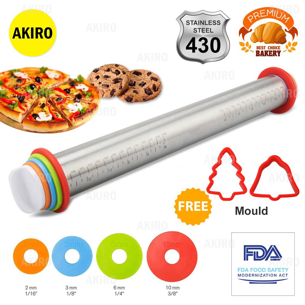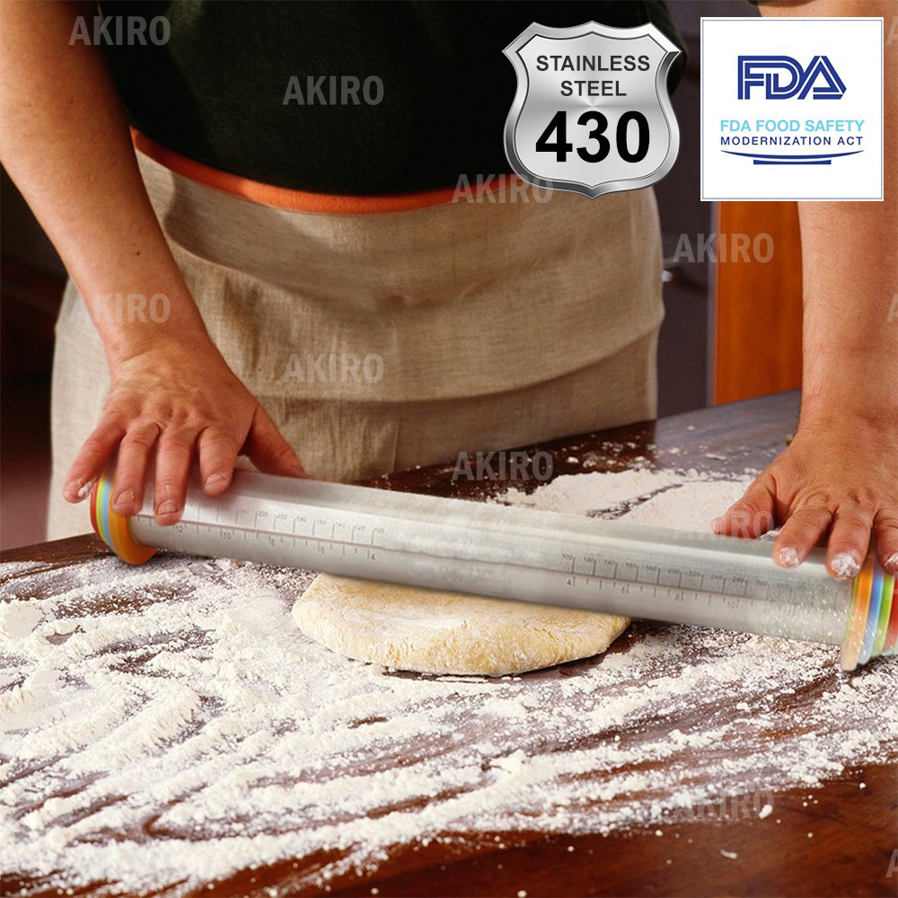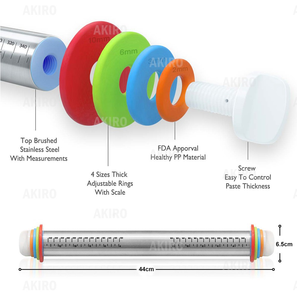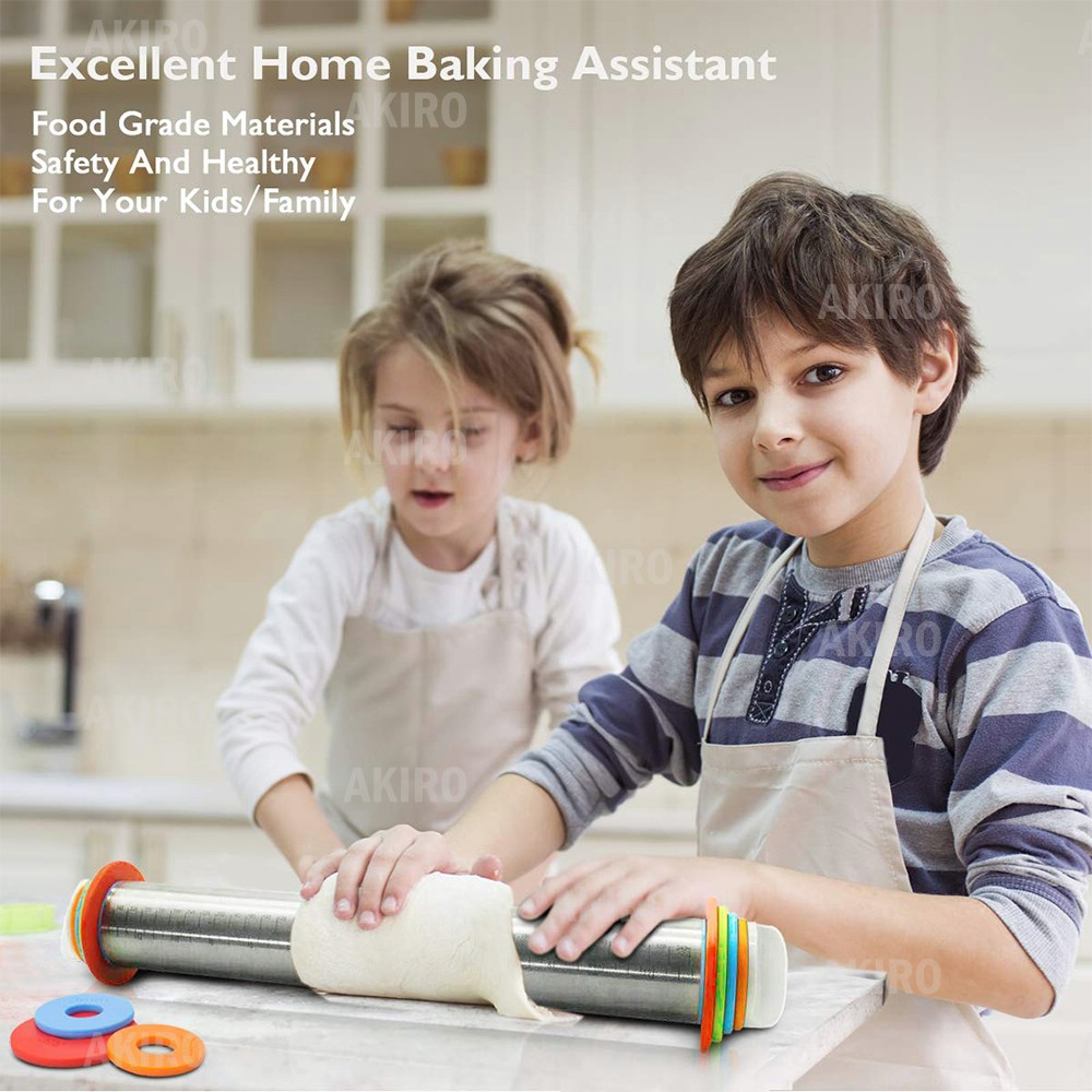 AKIRO Stainless Steel Rolling Pin Adjustable Thickness Roller Cookie Dough Fondant Icing Kitchen Baking Cake Pastry Tool