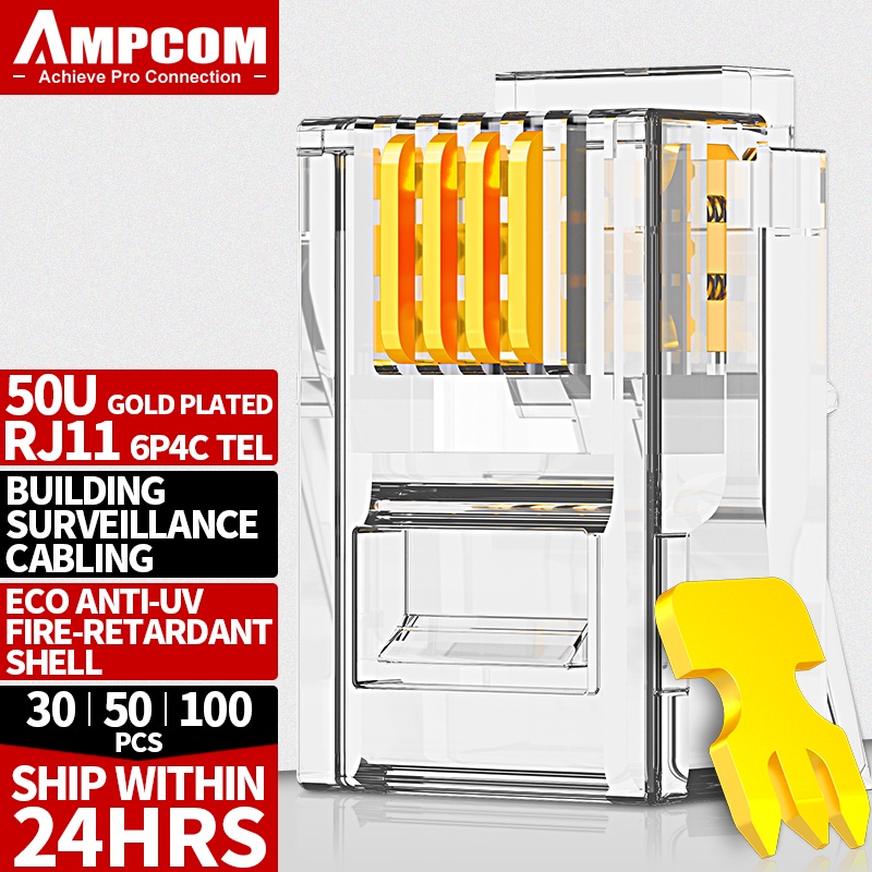 AMPCOM RJ11 Plug 6P4C Modular Phone Cord Connector Adapter Crimp Telephone Internet Modular Plug Jack