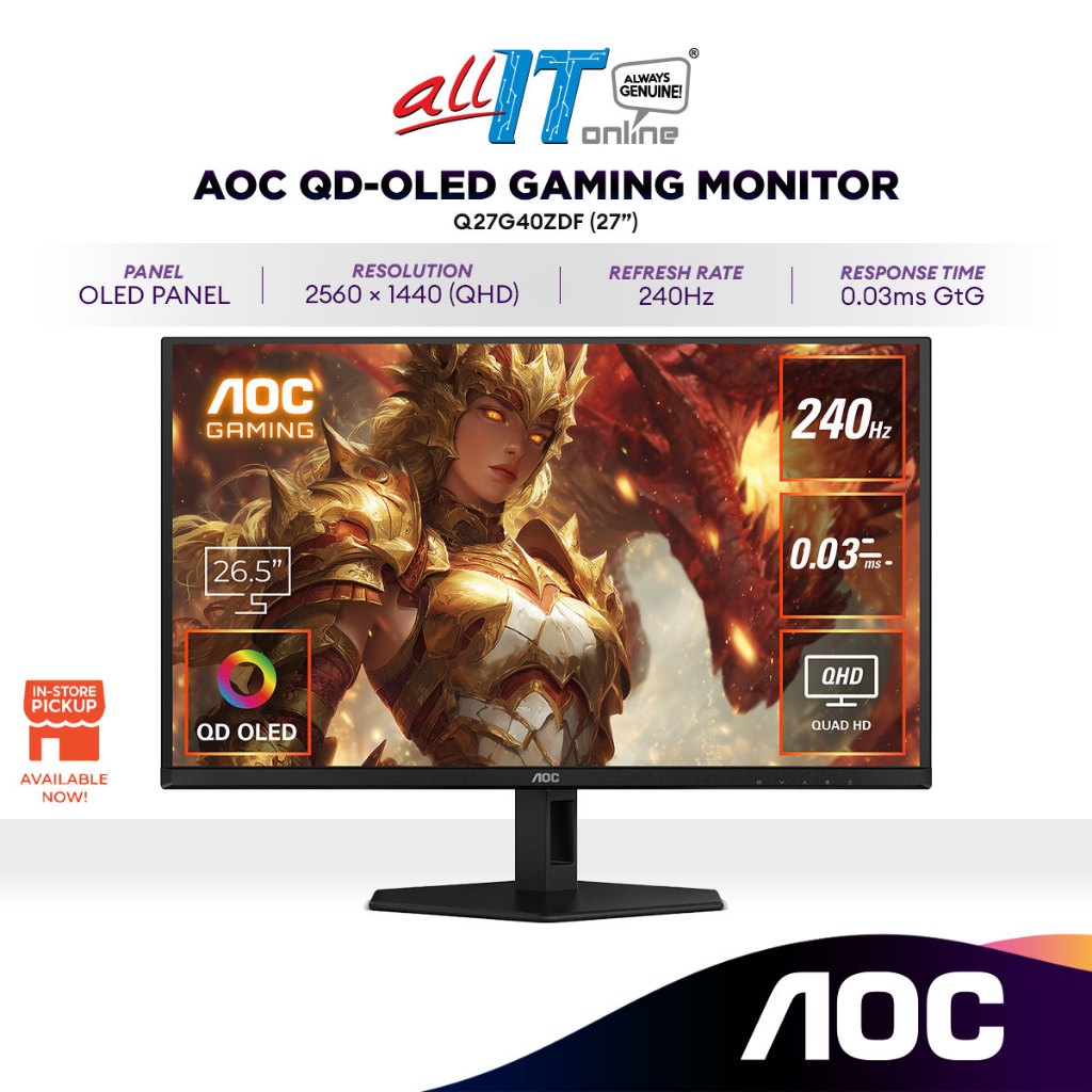AOC Q27G40ZDF 27” QD-OLED QHD 240Hz Gaming Monitor | 0.03ms | 2560x1440 | HDR400 | Adaptive Sync | Flicker-free