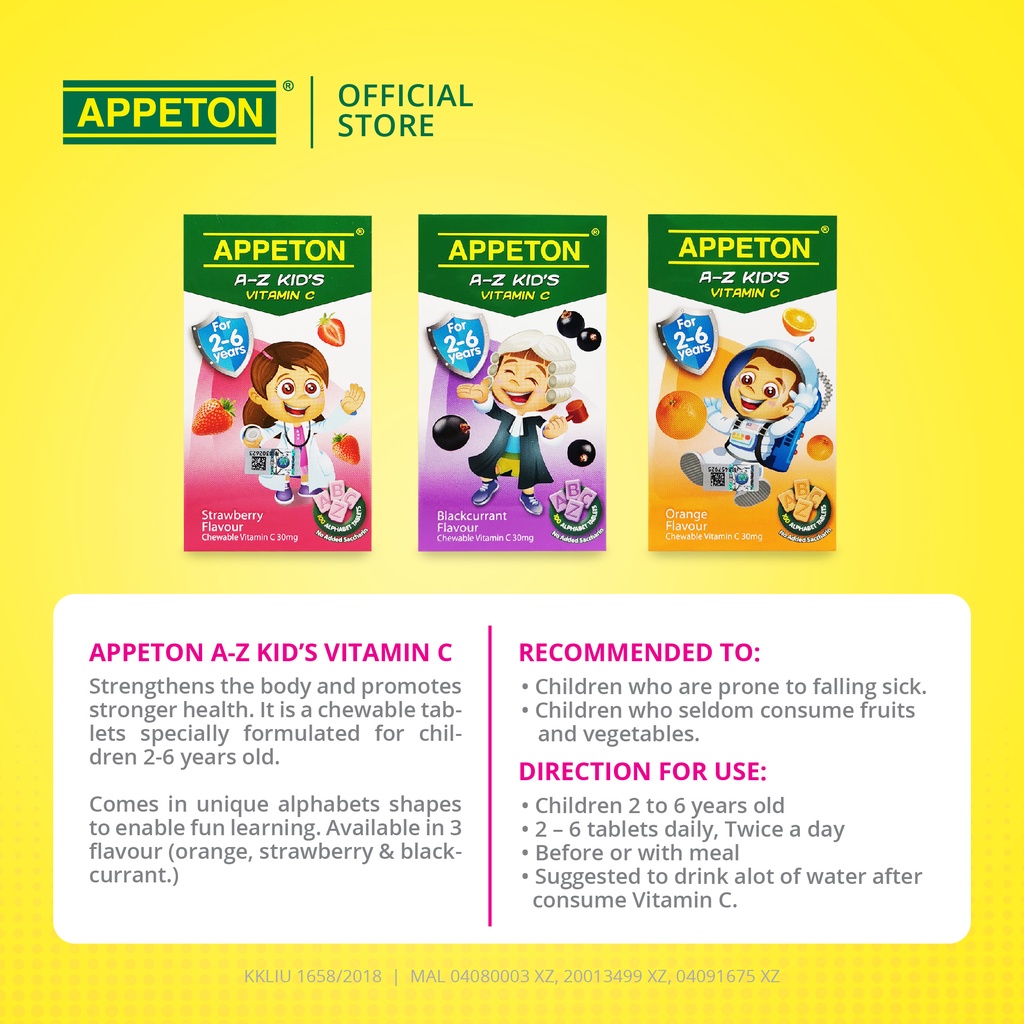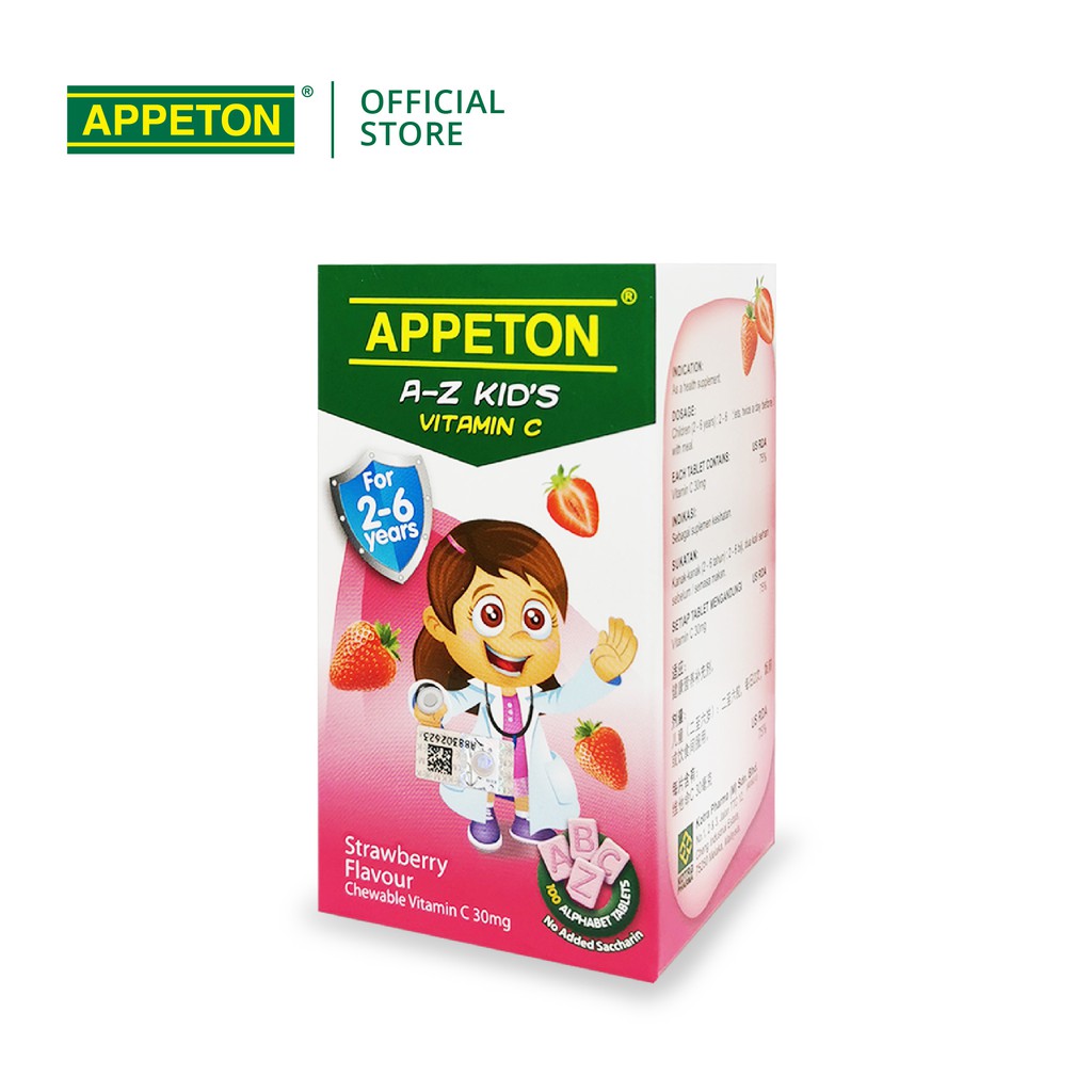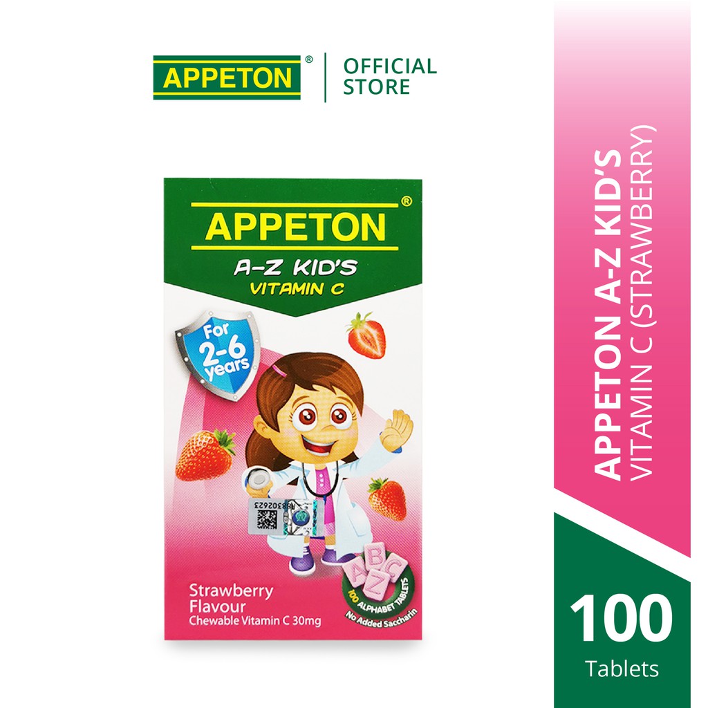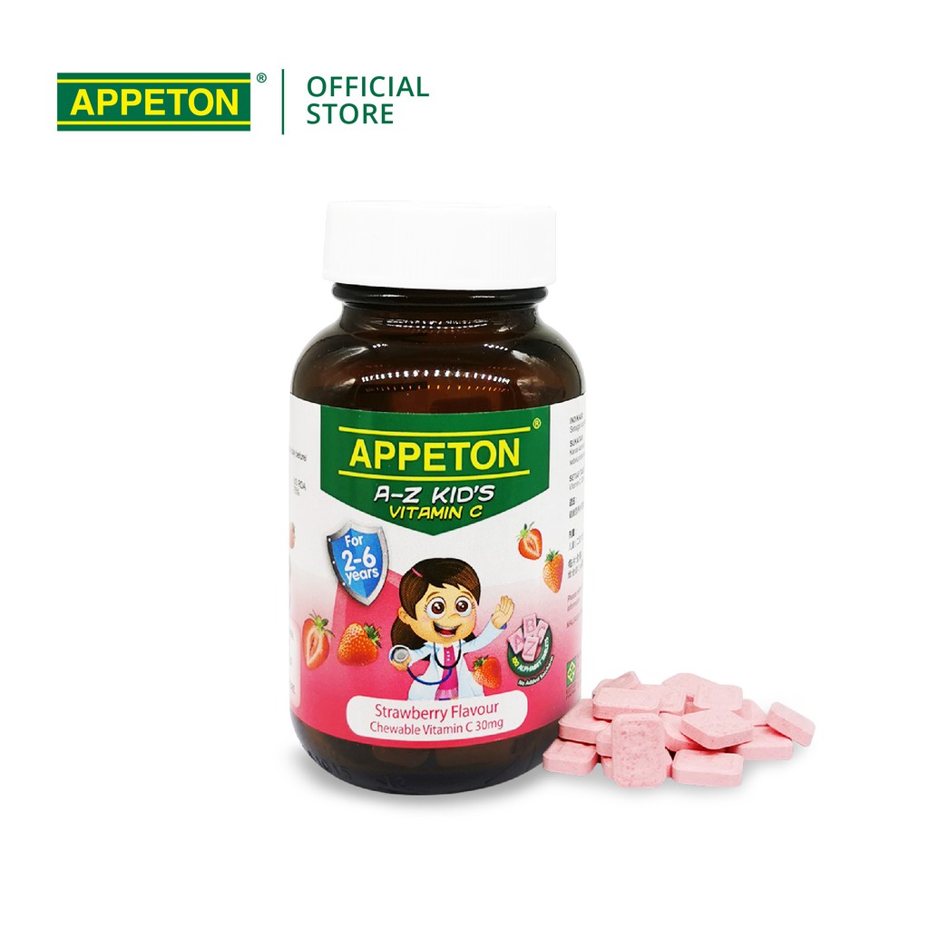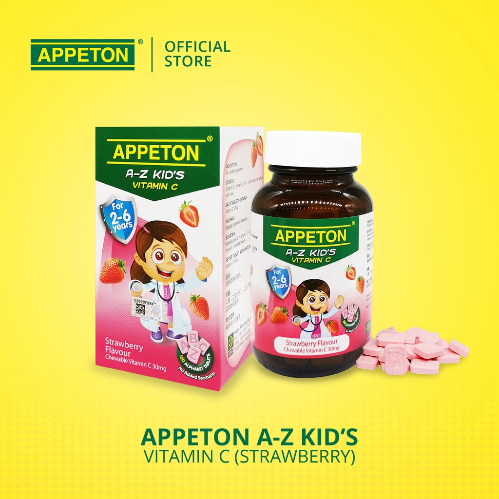 APPETON A-Z Kid's Vitamin C - Tablet Vitamin C 30mg untuk Kanak-Kanak 2-6 Tahun (Perisa Strawberi - 100's)