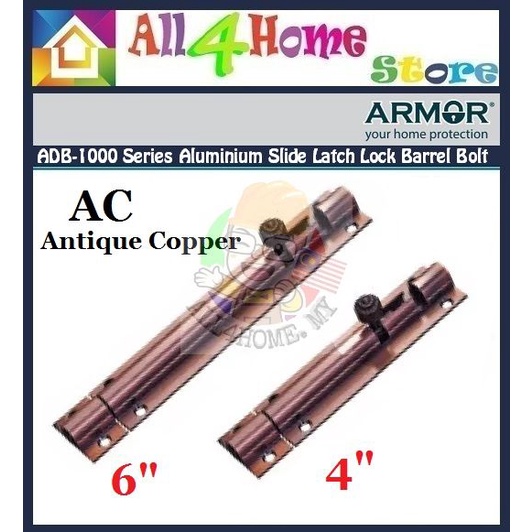 ARMOR ADB-1000 Series Aluminium Slide Latch Lock Barrel Bolt Latch Slide Door Bolt (AC-Antique Copper) (4" / 6" )