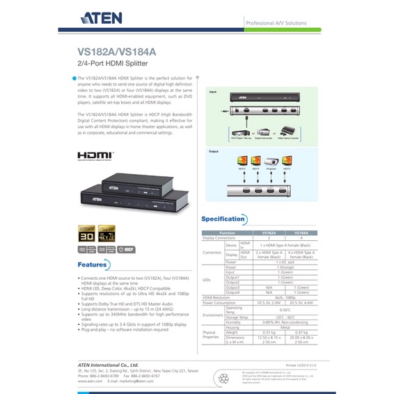 ATEN VS182A VS184A 2 / 4 PORT 4K HDMI SPLITTER [VS182A /VS184A] FOR TV,LCD MONITOR,VIDEO CONFERENCE