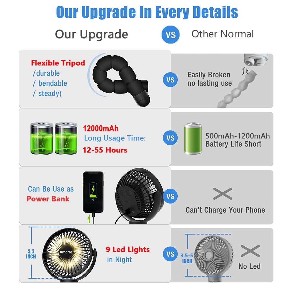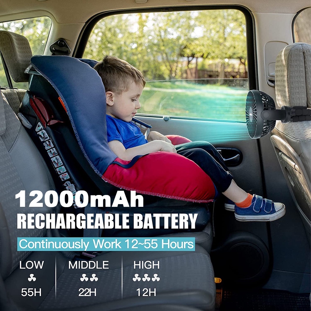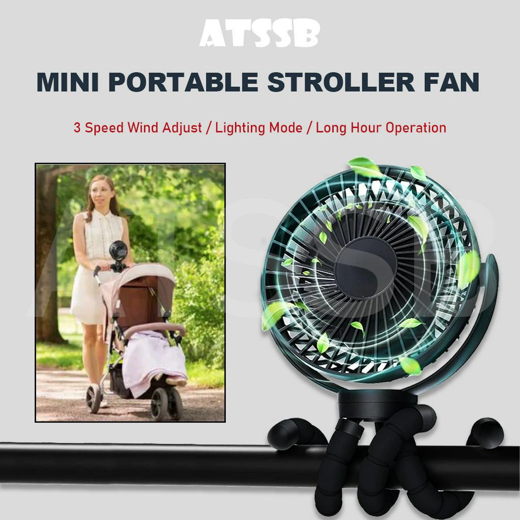 ATSSB 12000mAh Portable Stroller Fan fan USB Rechargeable Mini Kipas Handheld Quiet Fan Tripod LED Night Light