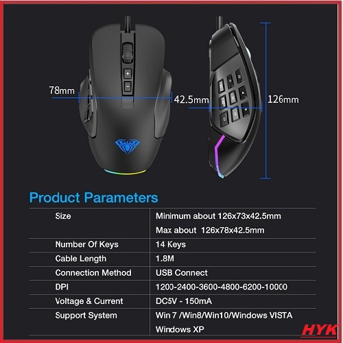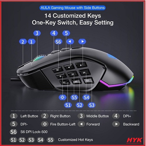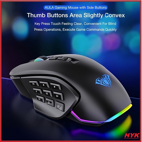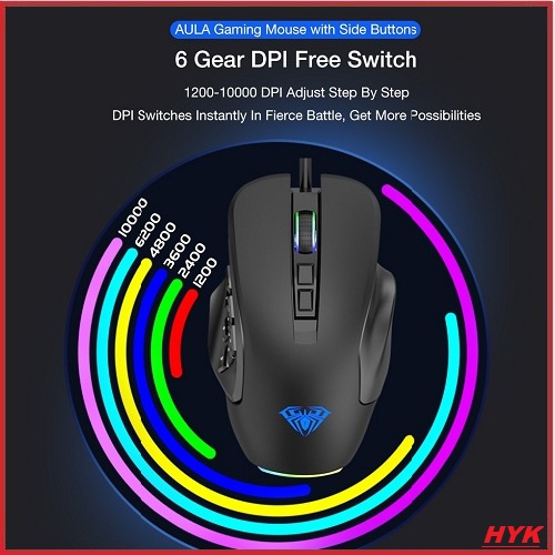 AULA H510 Wired Gaming Mouse with 9 Side Buttons 6 Gear DPI up to 10000 Optical RGB Full Color Lighting Indicator for PC