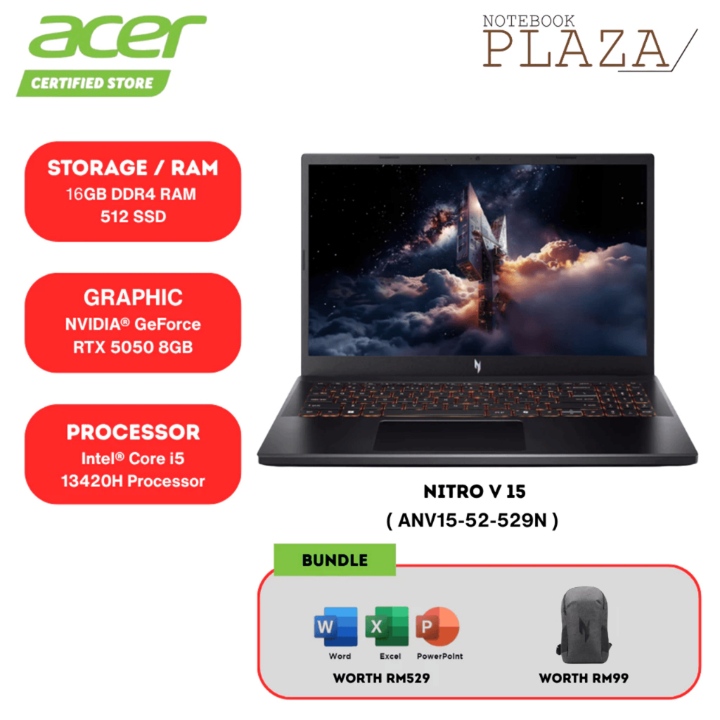 Acer Nitro V 15 ANV15-52-529N 15.6" FHD 180Hz Gaming Laptop ( i5-13420H, 16GB, 512GB SSD, RTX5050 8GB, W11, HS+M365 )