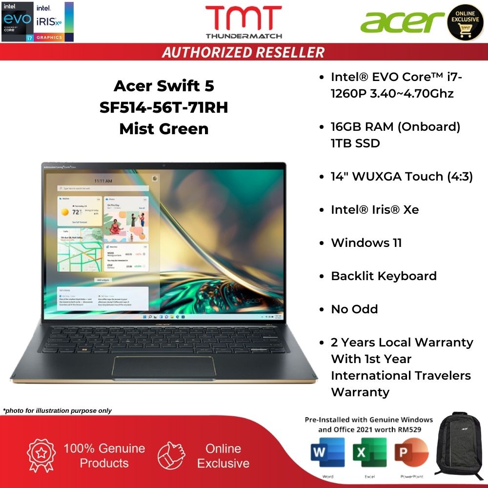 Acer Swift 5 SF514-56T-71RH Green Laptop | EVO Core i7-1260P | 16GB RAM 1TB SSD | 14" WUXGA Touch | Intel Iris Xe | W11 | Backlit KB+MS OFFICE+BAG