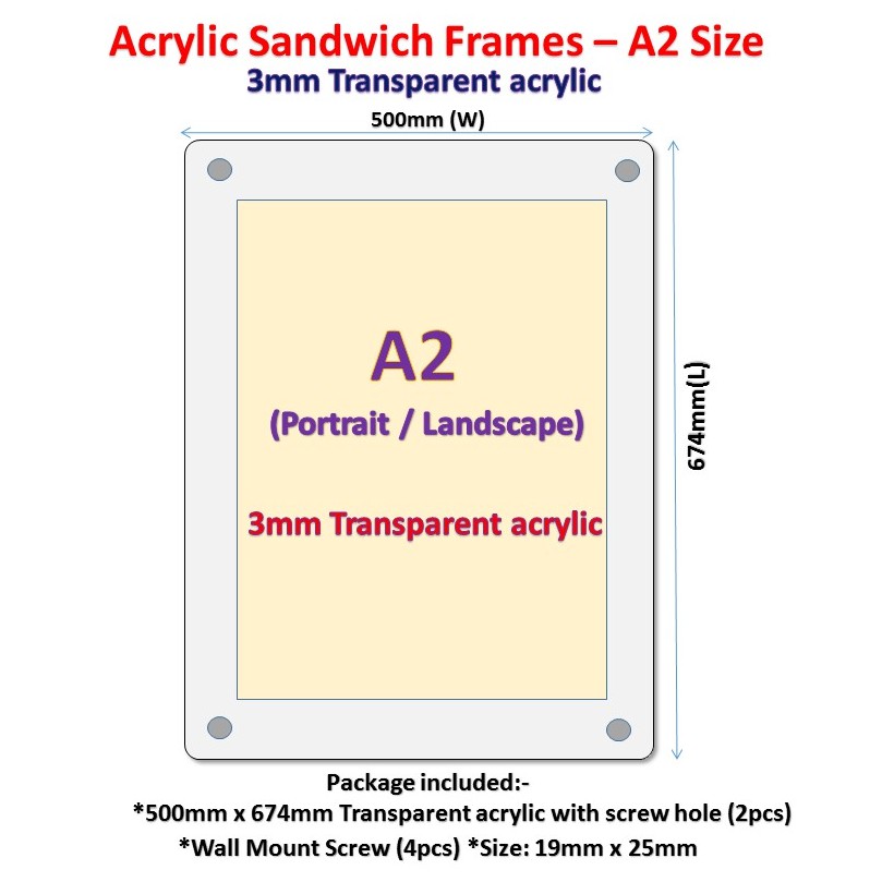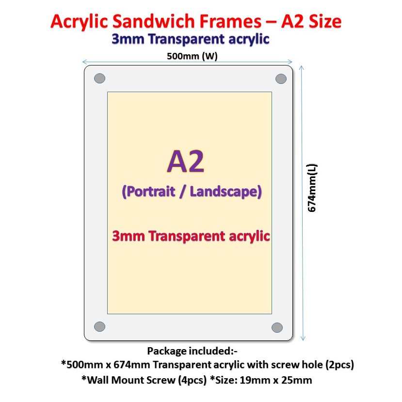 Acrylic Poster frame -Fit A2 size poster -home/office wall display frame/Sandwich frame-casting acrylic