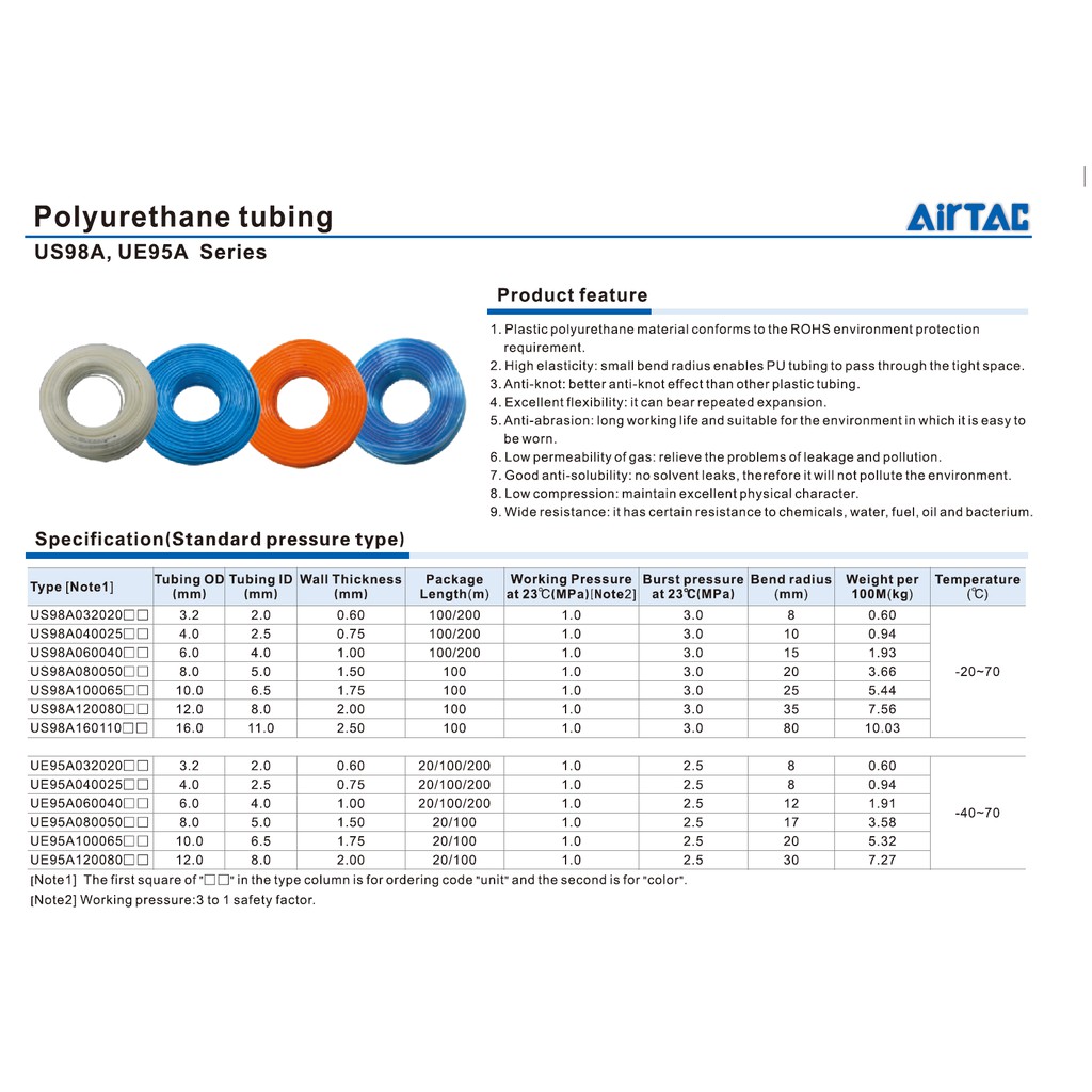 AirTac PU Tubing Pneumatic Tubing Air Tubing AirTac Polyurethane Tubing PU Hose SMC Pneumatic 6X4MM 8X5MM