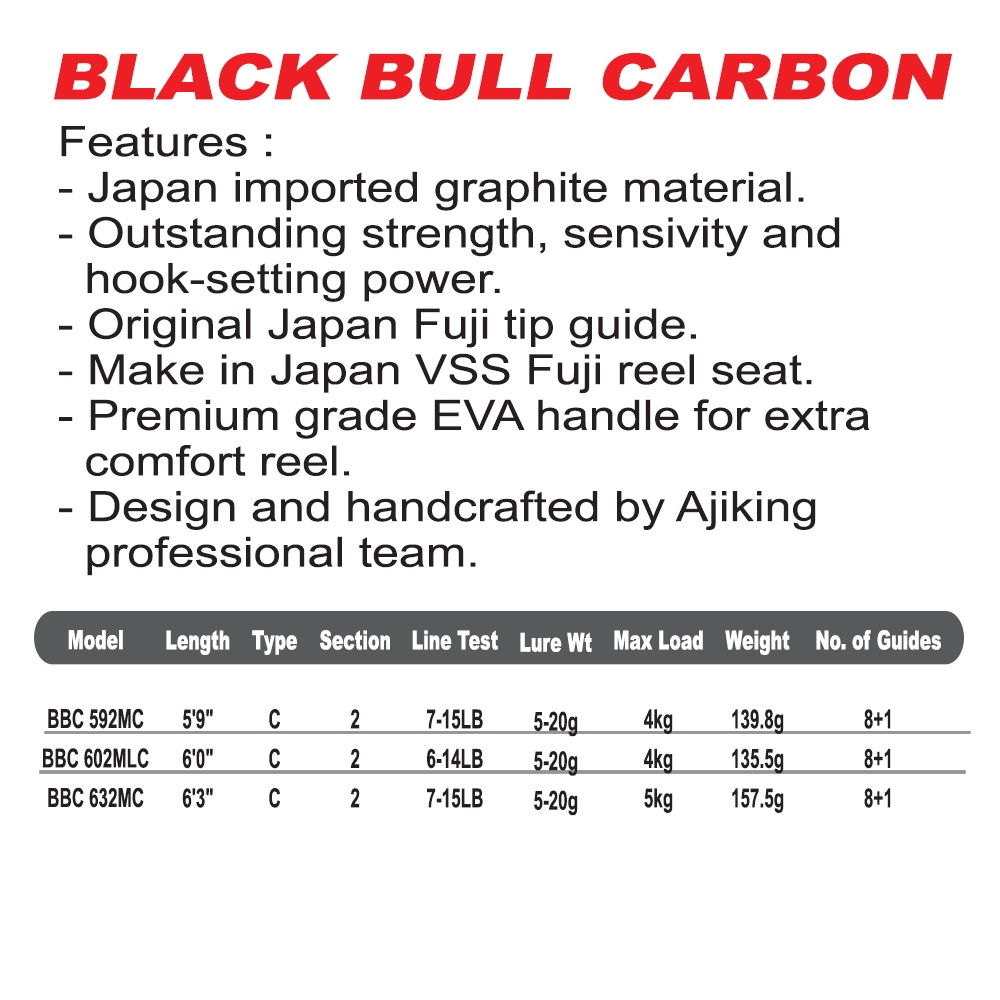 Ajiking Black Bull Carbon Casting Fishing Rod Max Load (4-5kg/5'9ft/6'3ft)