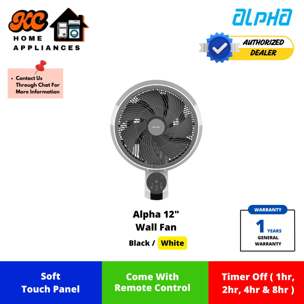 Alpha 12" Wall Fan | 65W | 3 Fan Speed | Remote Control | Auto Swing | Black/White | MOTTO WALL FAN 60 | 1 Year Warranty