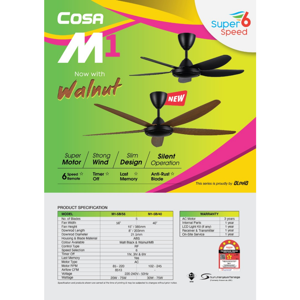 Alpha Cosa M1 5B 56/40 Ceiling Fan Remote Control 6 Speeds Matt Black / Walnut