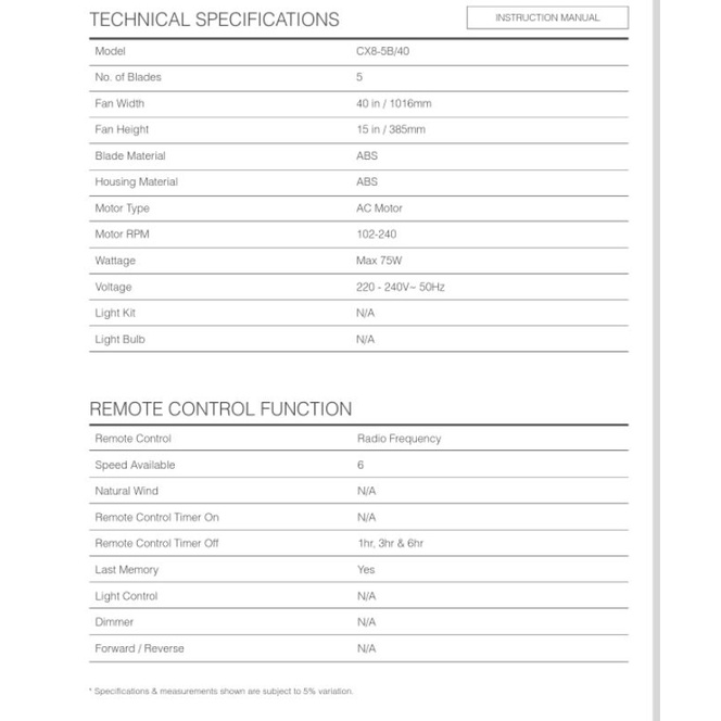 Alpha Cosa Xpress 40" / 56" 5 Blades 6 Speeds Ceiling Fan Remote Control COSA CX8
