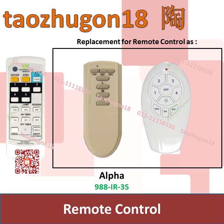 Alpha Wall Ceiling Fan Remote Control Siling Dinding Kipas 988-IR-3S