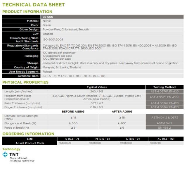 Ansell TouchNTuff 92-600 protection glove / Nitrile Glove / Rubber Glove
