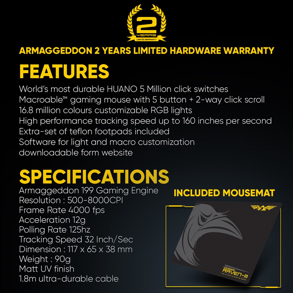 Armaggeddon Raven 3 Wired Gaming Mouse | 8000 CPI | Free Mouse Mat