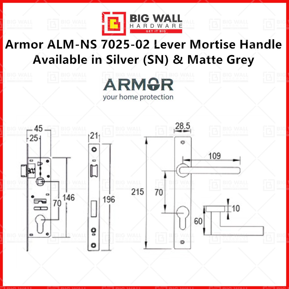 Armor Grill Door Lock 7025 02 Lever Mortise Handle Complete with 25 x 70mm Mortise Sash Lock & 60mm Double Key Cylinder