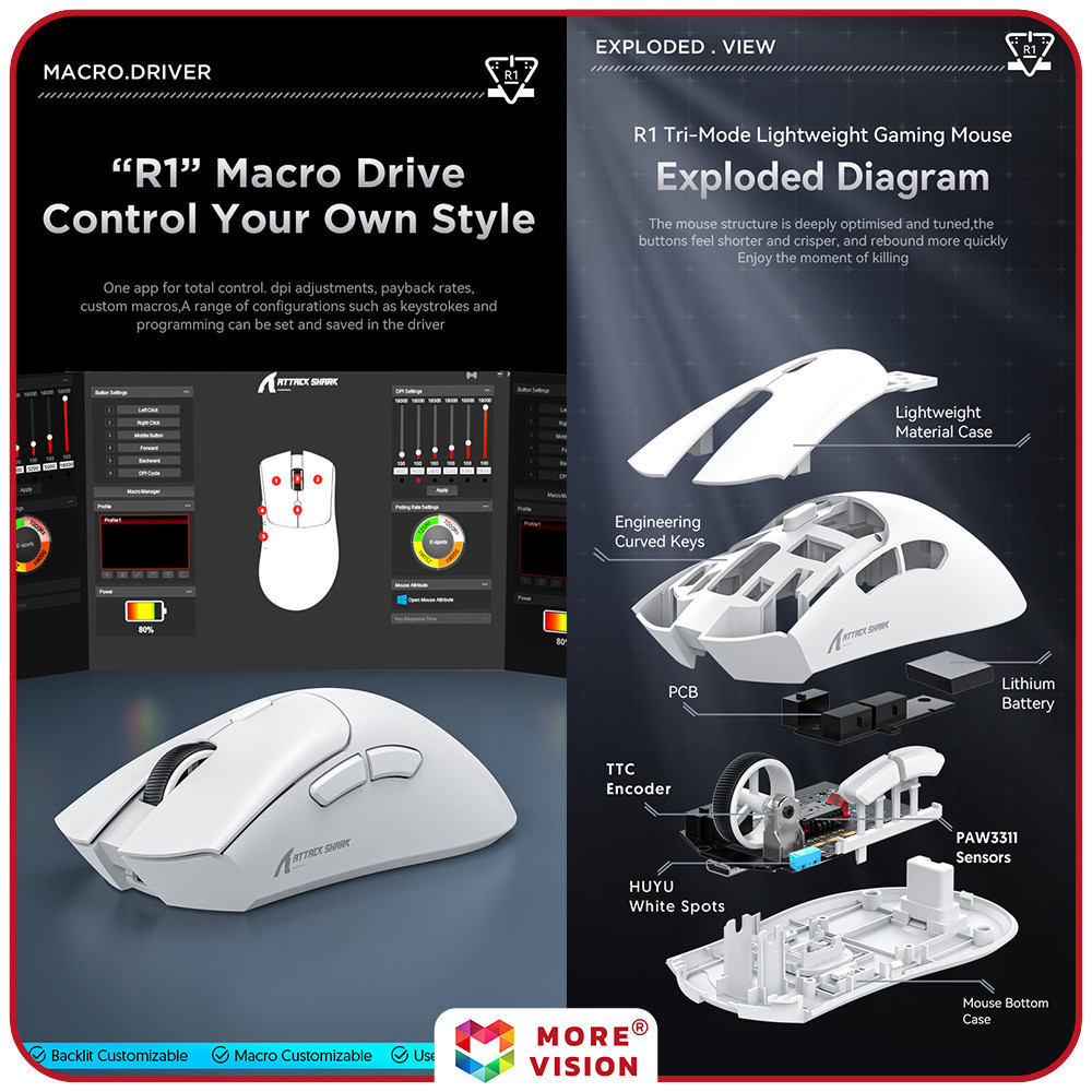 Attack Shark R1 Mouse Wireless 18000dpi Tri-mode Bluetooth USB 2.4G Cable 1000Hz PAW3311 Macro Gaming PC Laptop Mice