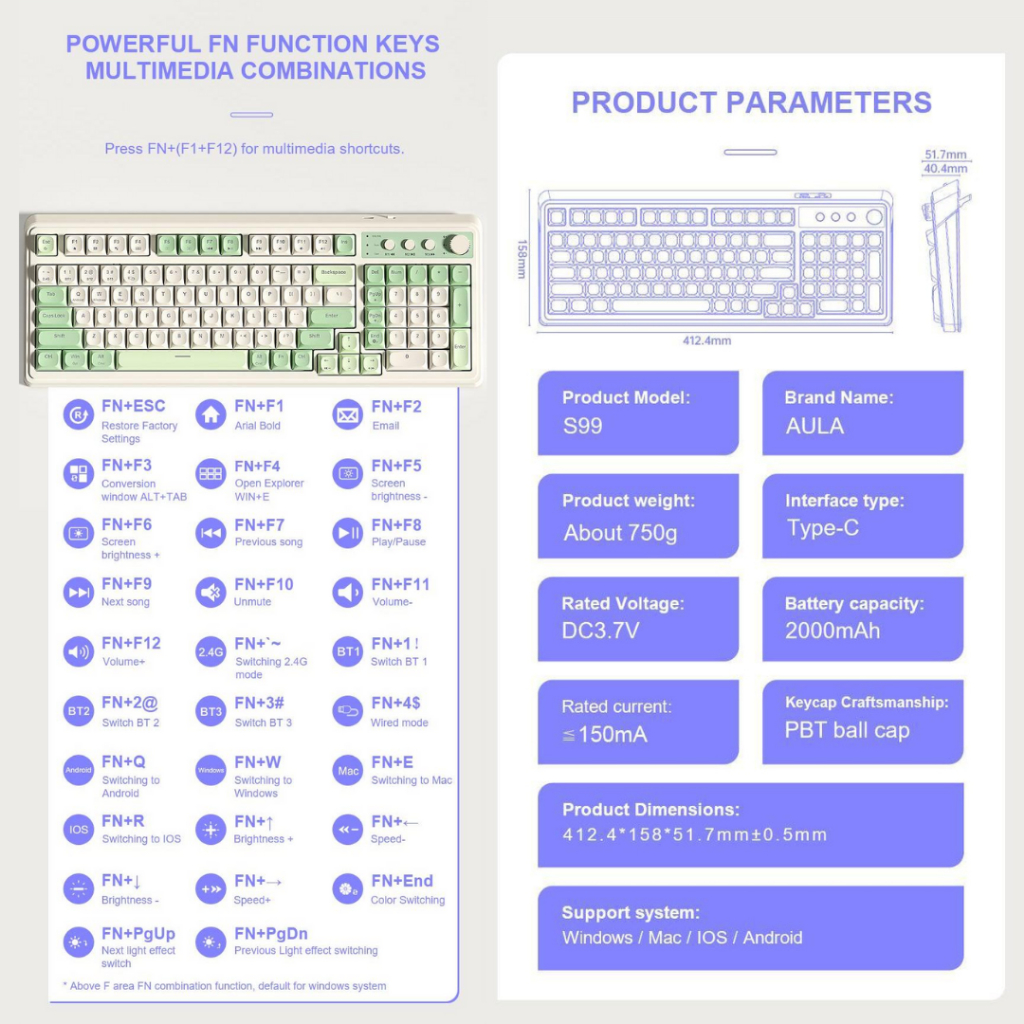 Aula S99 RGB Membrane Keyboard 3Mode Wireless Bluetooth Wired Keyboard Abs Keycaps rechargeable