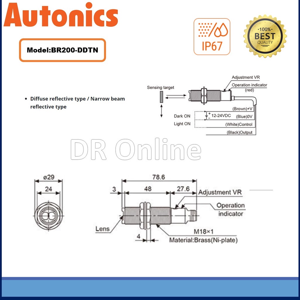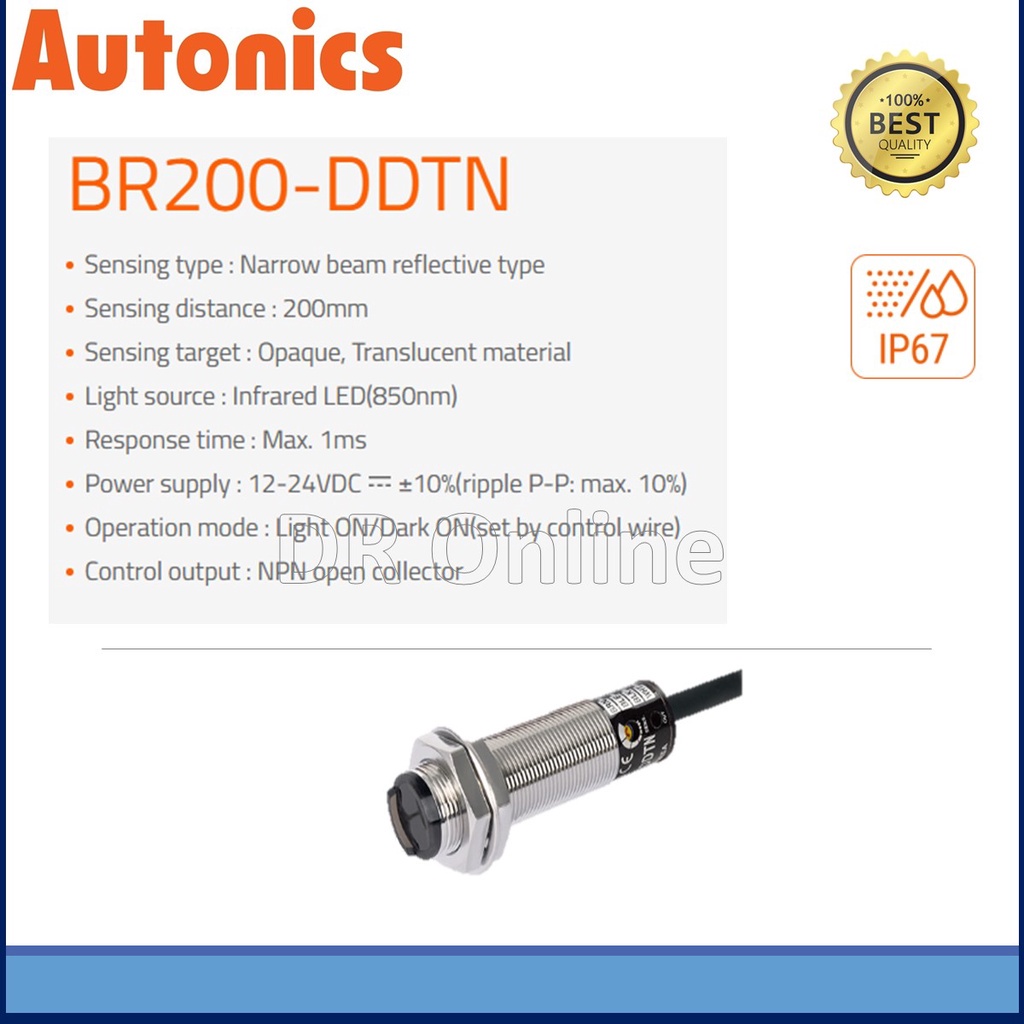 Autonics Photoelectric Sensor Diffuse Reflective, Narrow Beam, Light and Dark On, NPN Output, 12-24 VDC ~ BR200-DDTNAuto