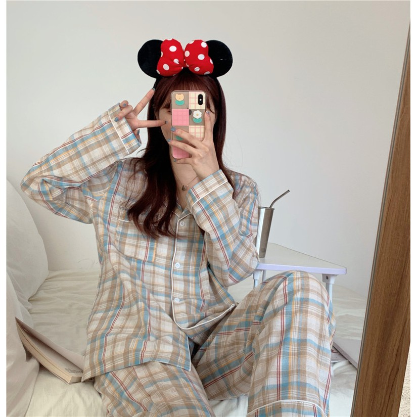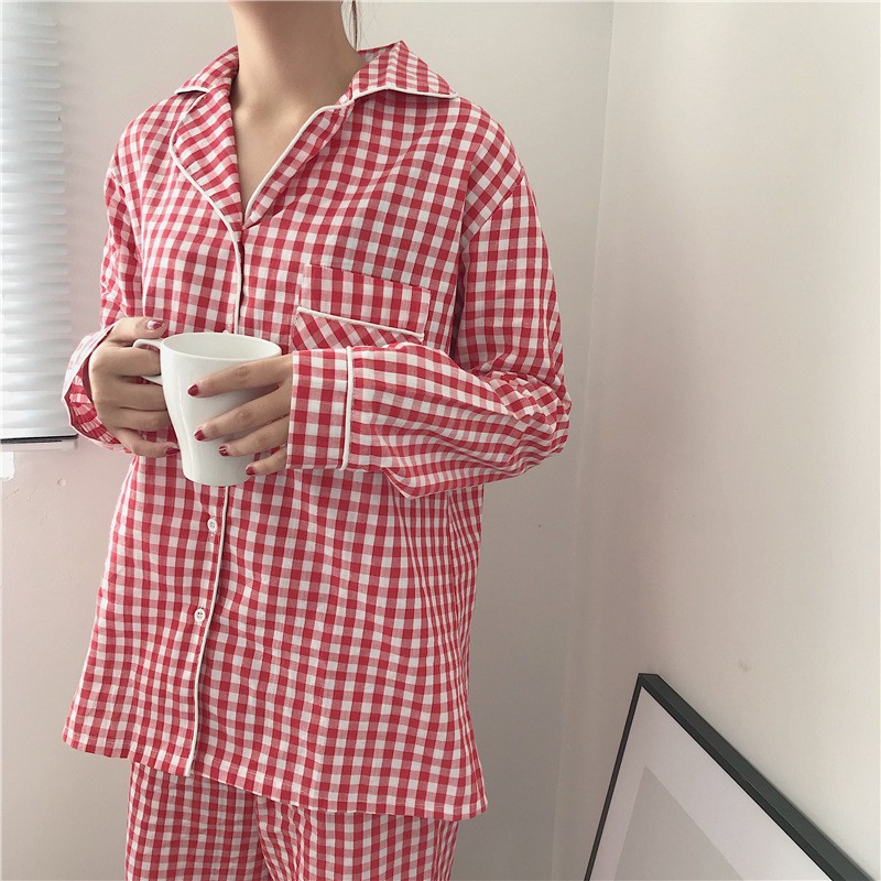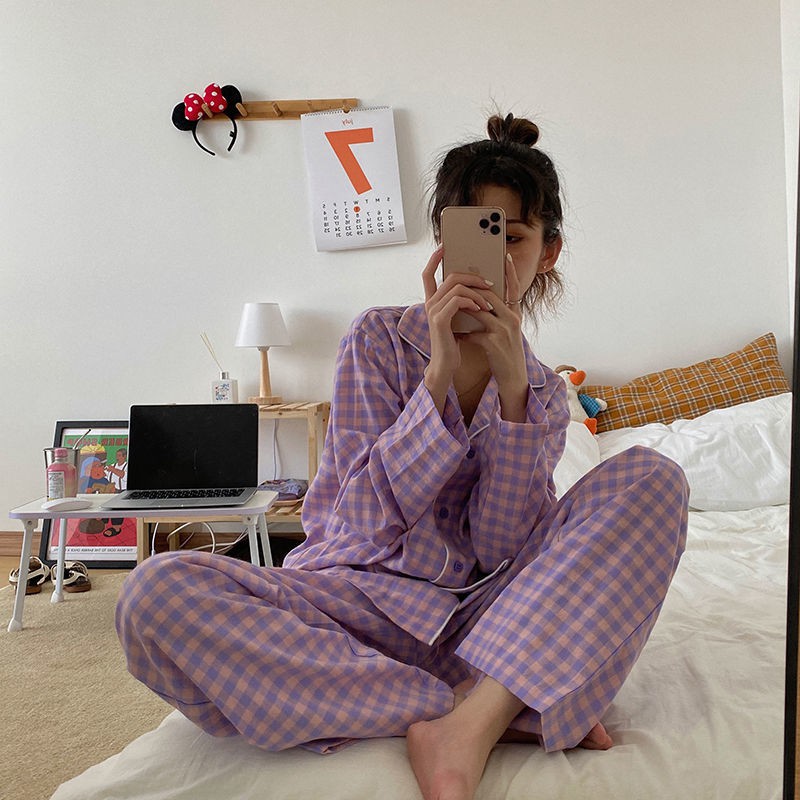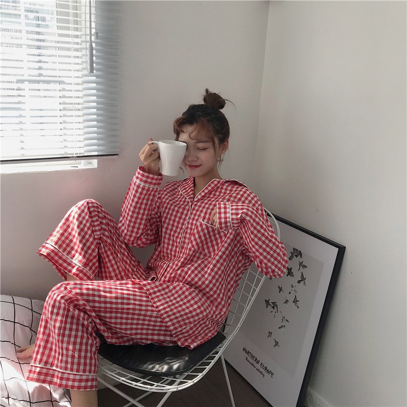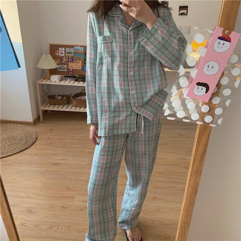Autumn winter new women's pajama Korean version small lapel cardigan student pajama girl long sleeve trousers home wear small fresh checked print can be worn over the pajama suit
