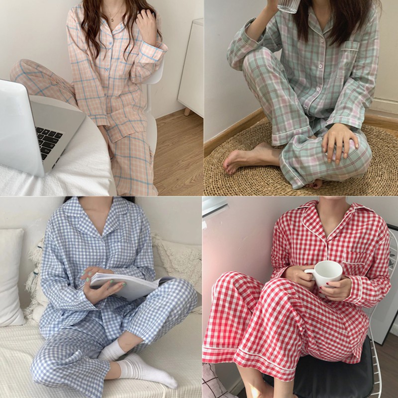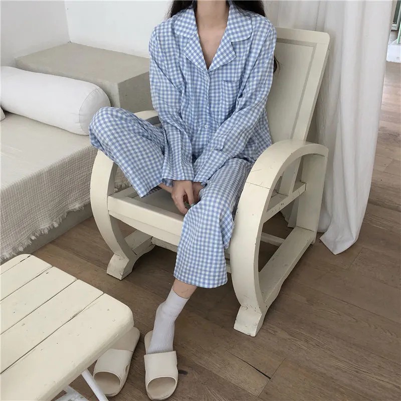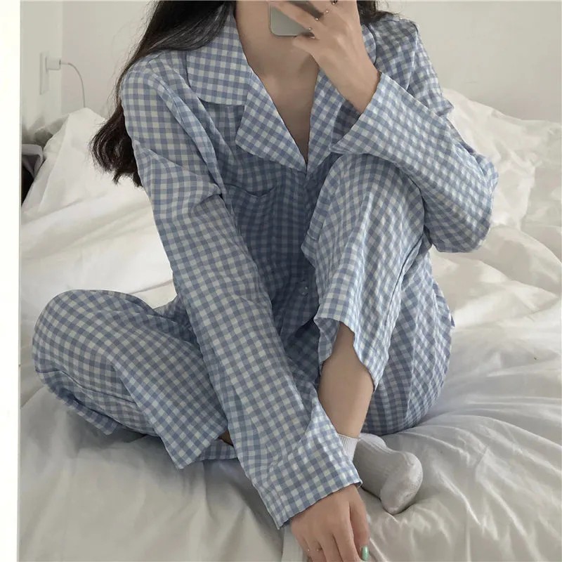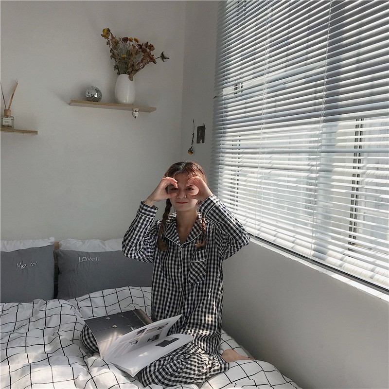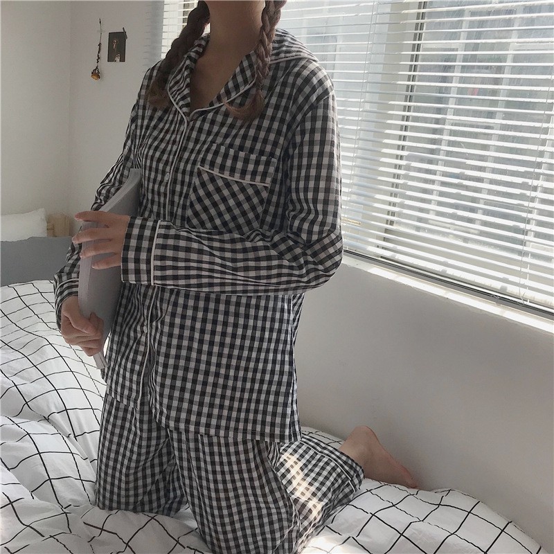 Autumn winter new women's pajama Korean version small lapel cardigan student pajama girl long sleeve trousers home wear small fresh checked print can be worn over the pajama suit