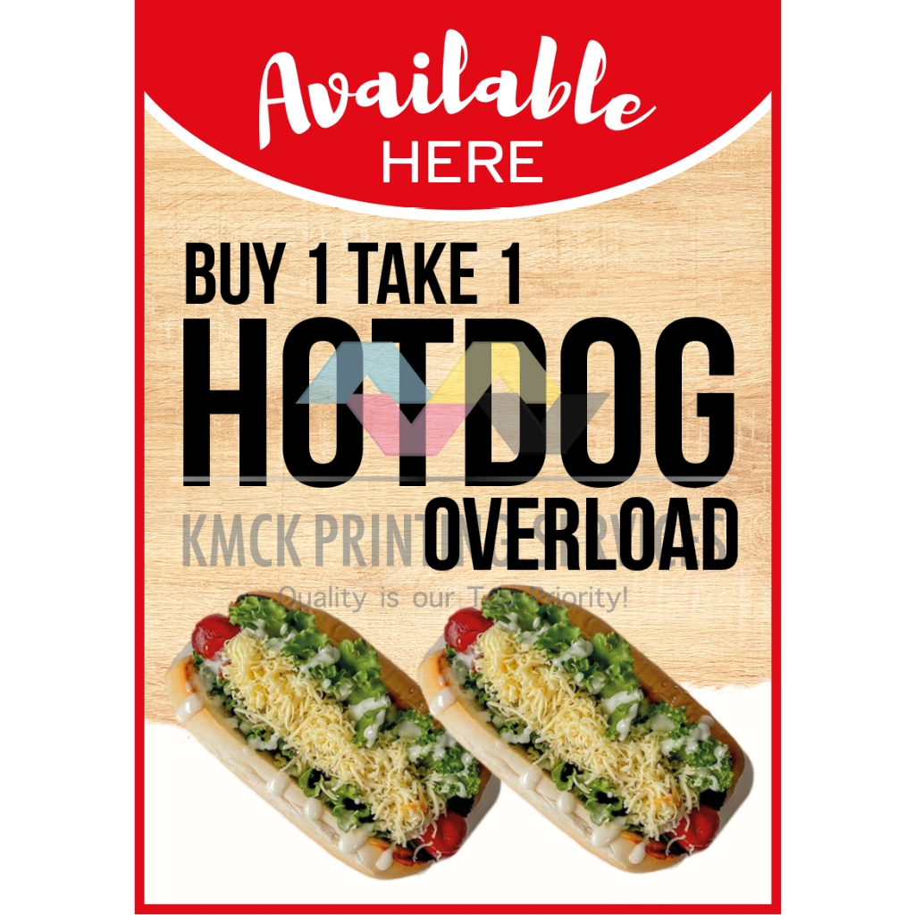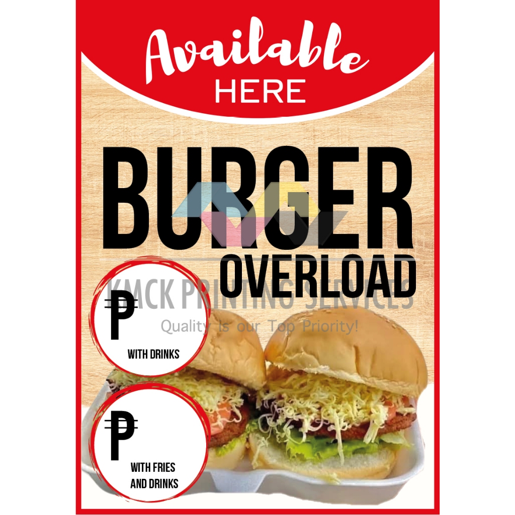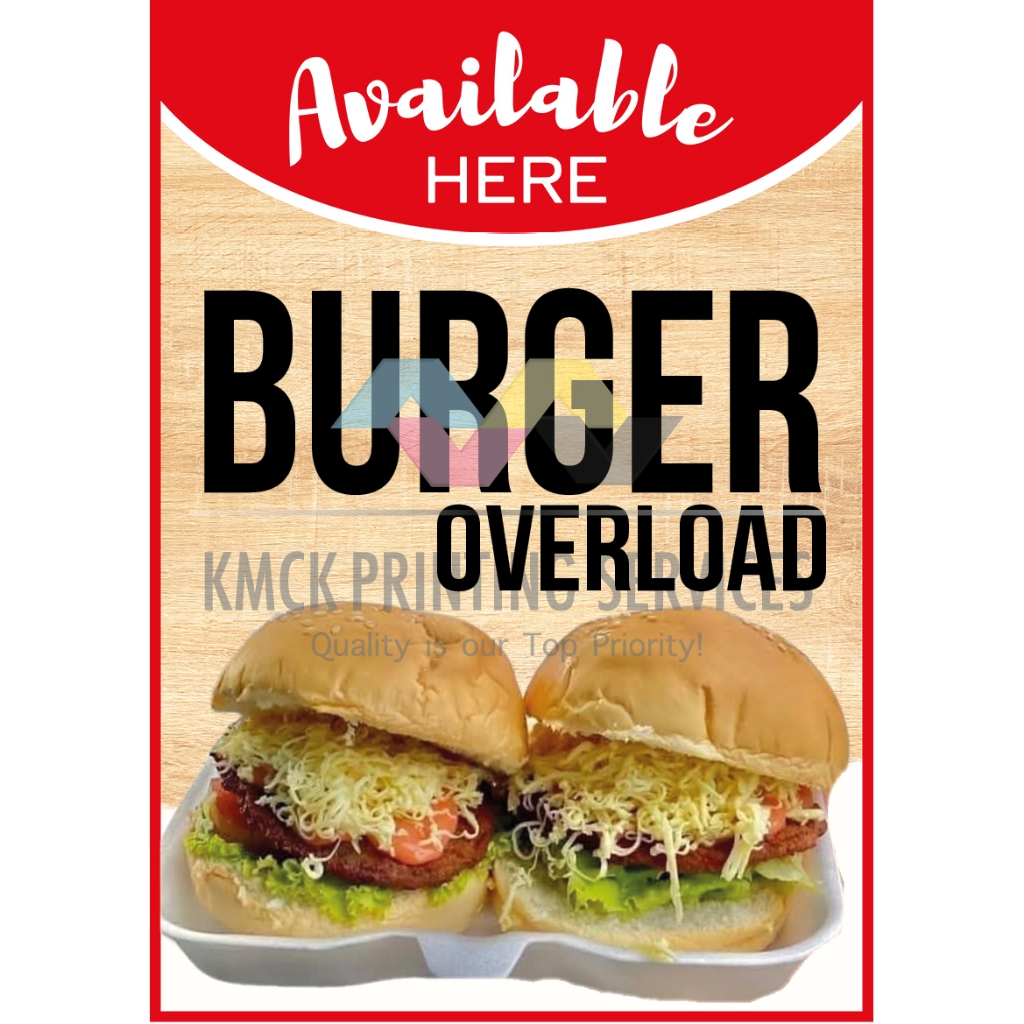 Available Here Burger Overload, Hotdog Overload, Mais & Saging Con Yelo Signage