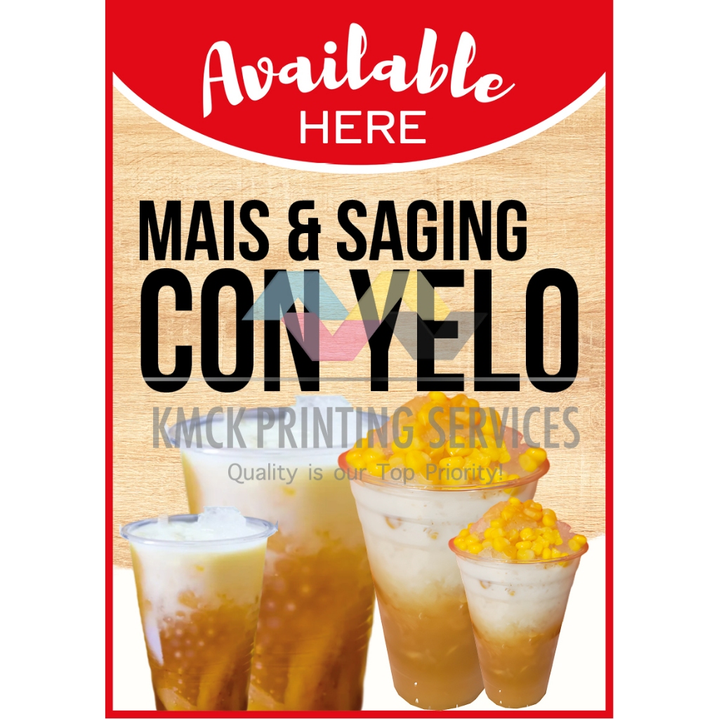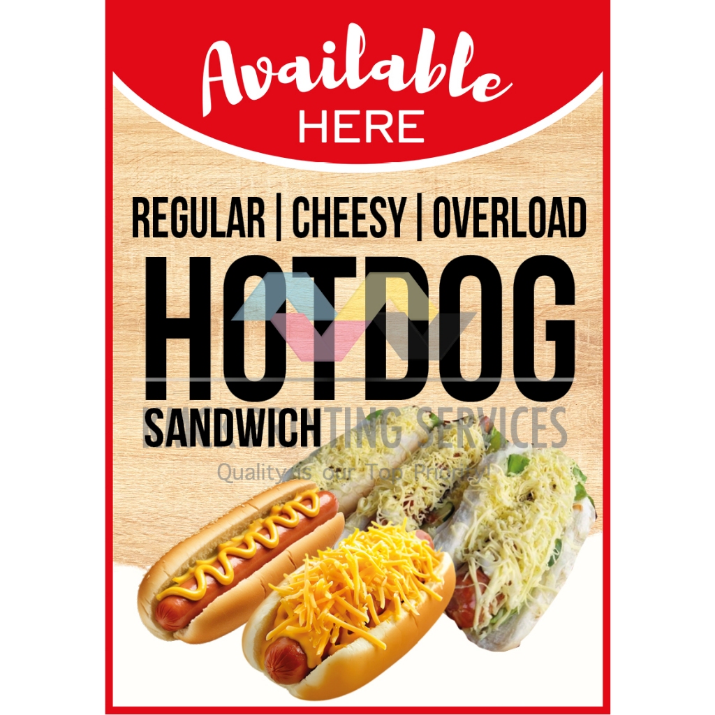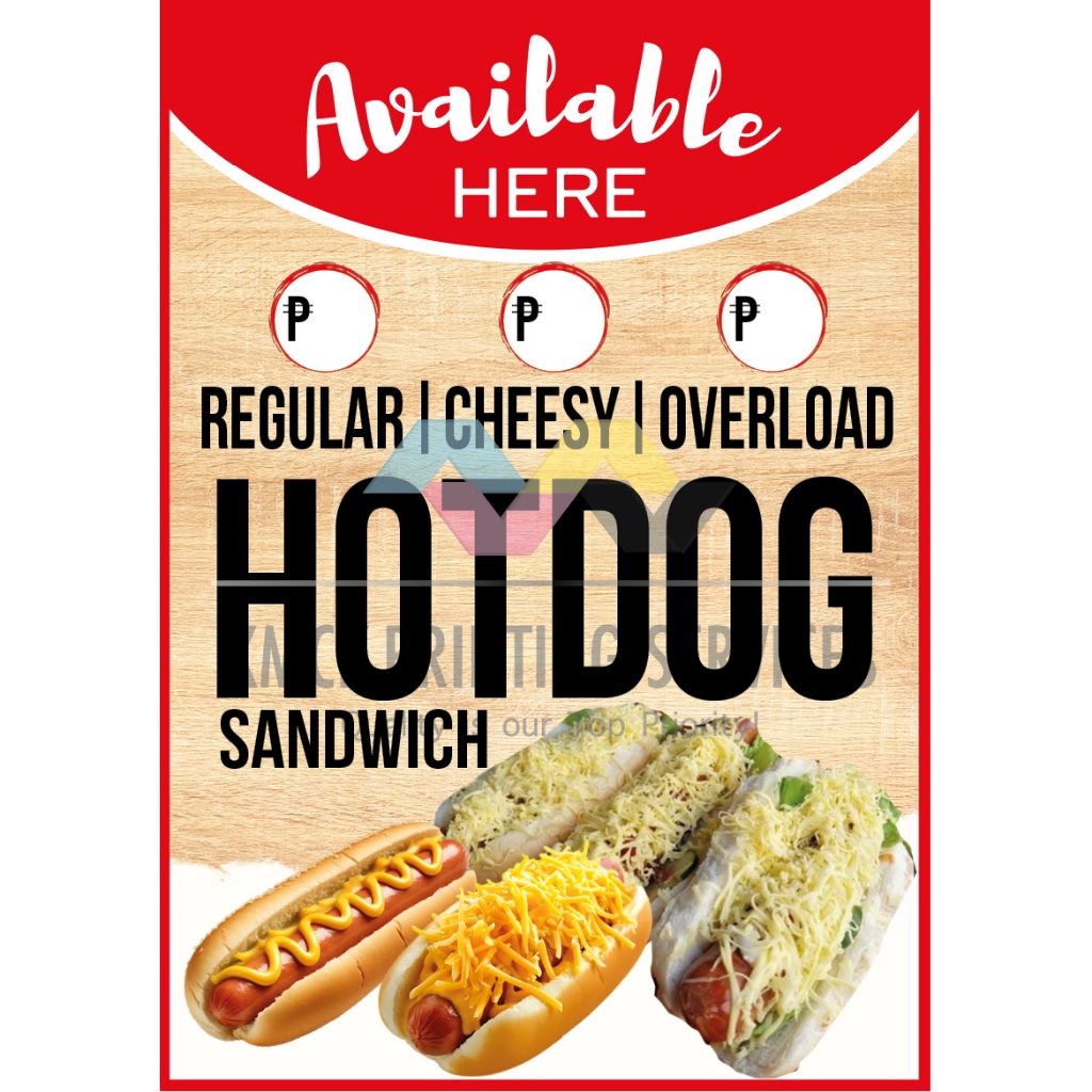 Available Here Burger Overload, Hotdog Overload, Mais & Saging Con Yelo Signage
