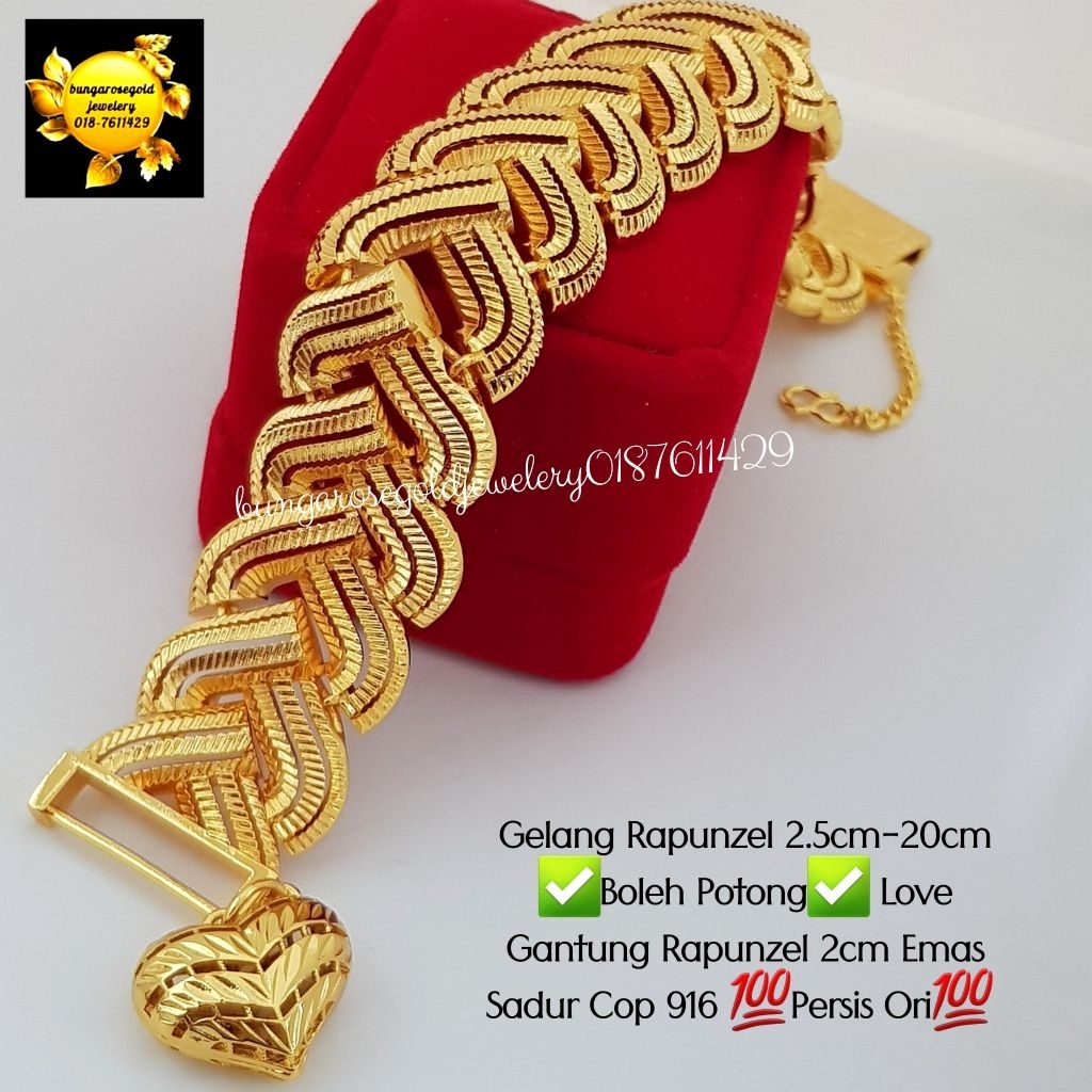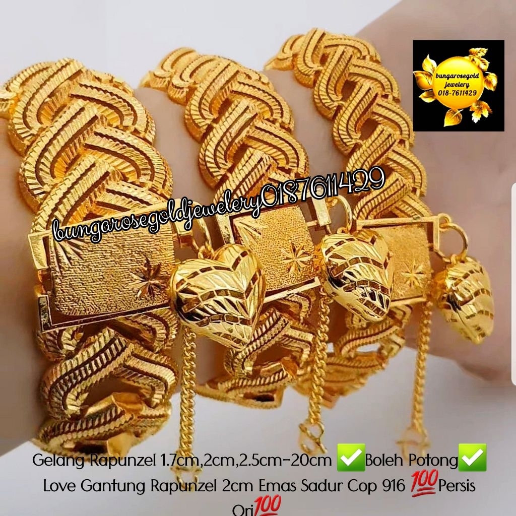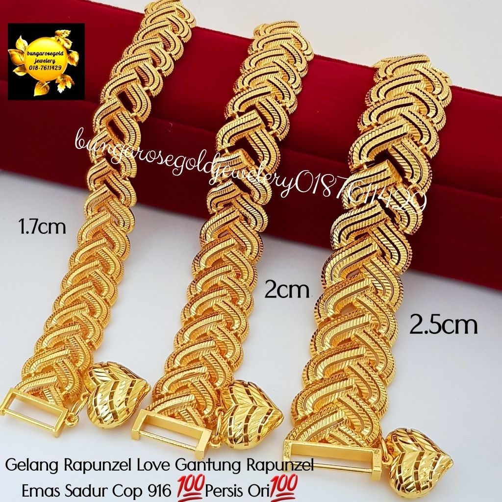 🔥Gelang Rapunzel 1.7cm,2cm,2.5cm-20cm ✅Boleh Potong✅ Love Gantung Rapunzel 2cm Emas Sadur Cop 916 💯Persis Ori💯 🔥