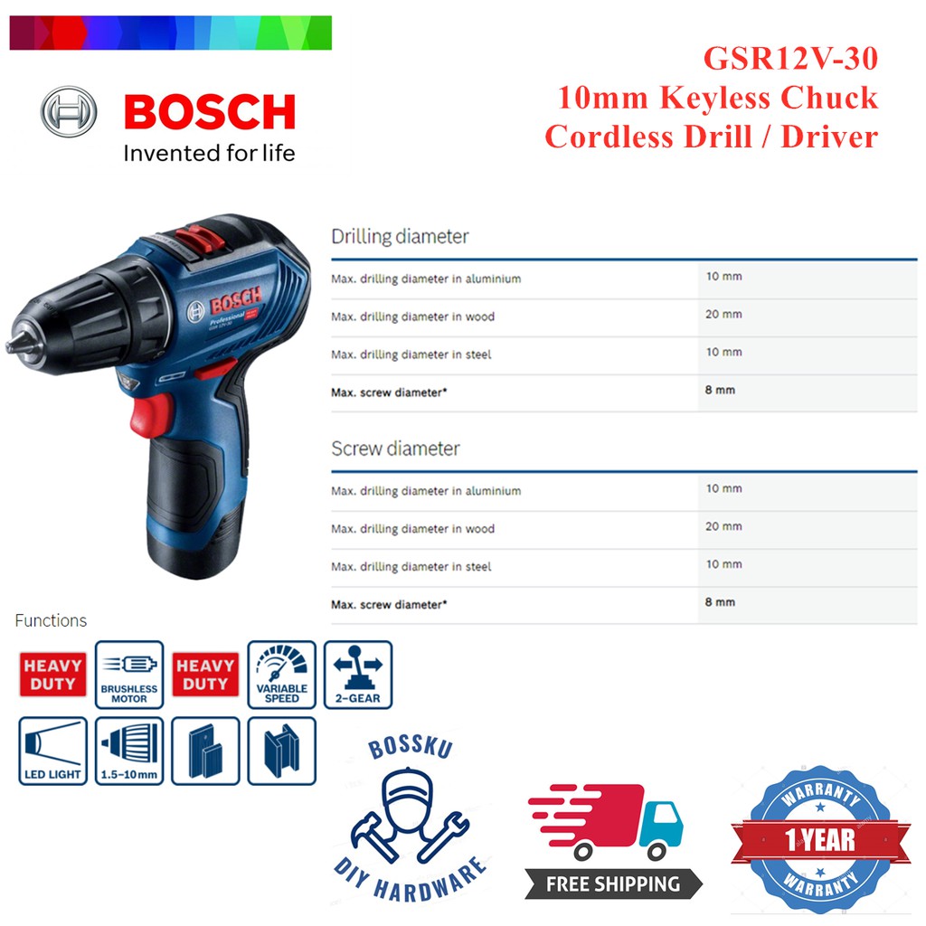 BOSCH 12V EC Brushless Cordless Drill / Driver GSR12V-30 10mm Keyless Chuck Full Set