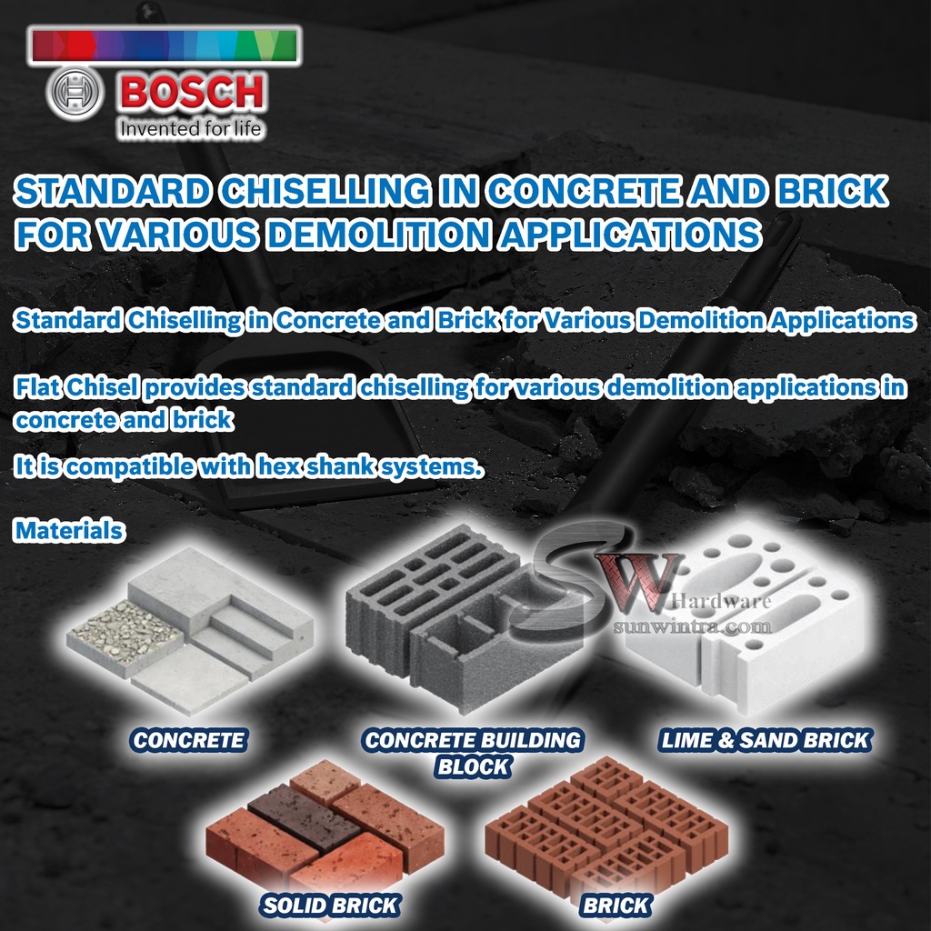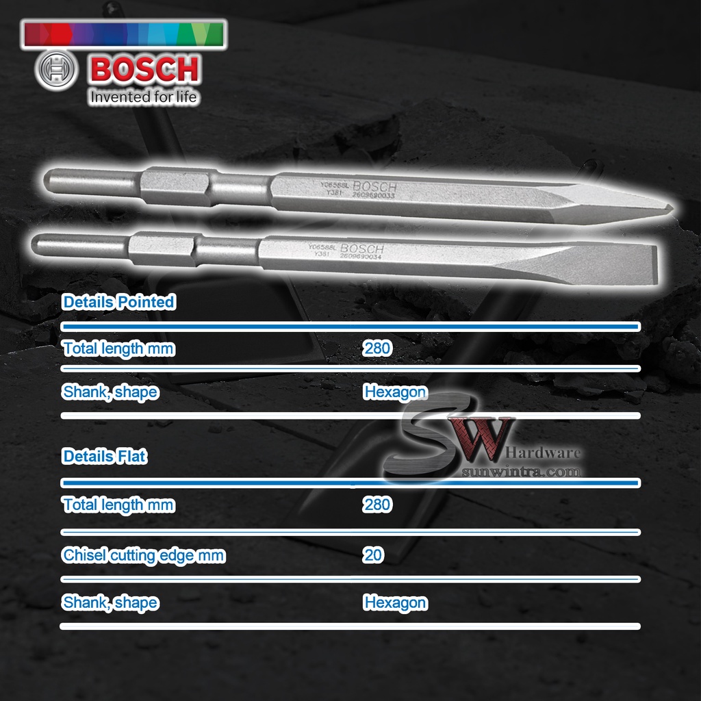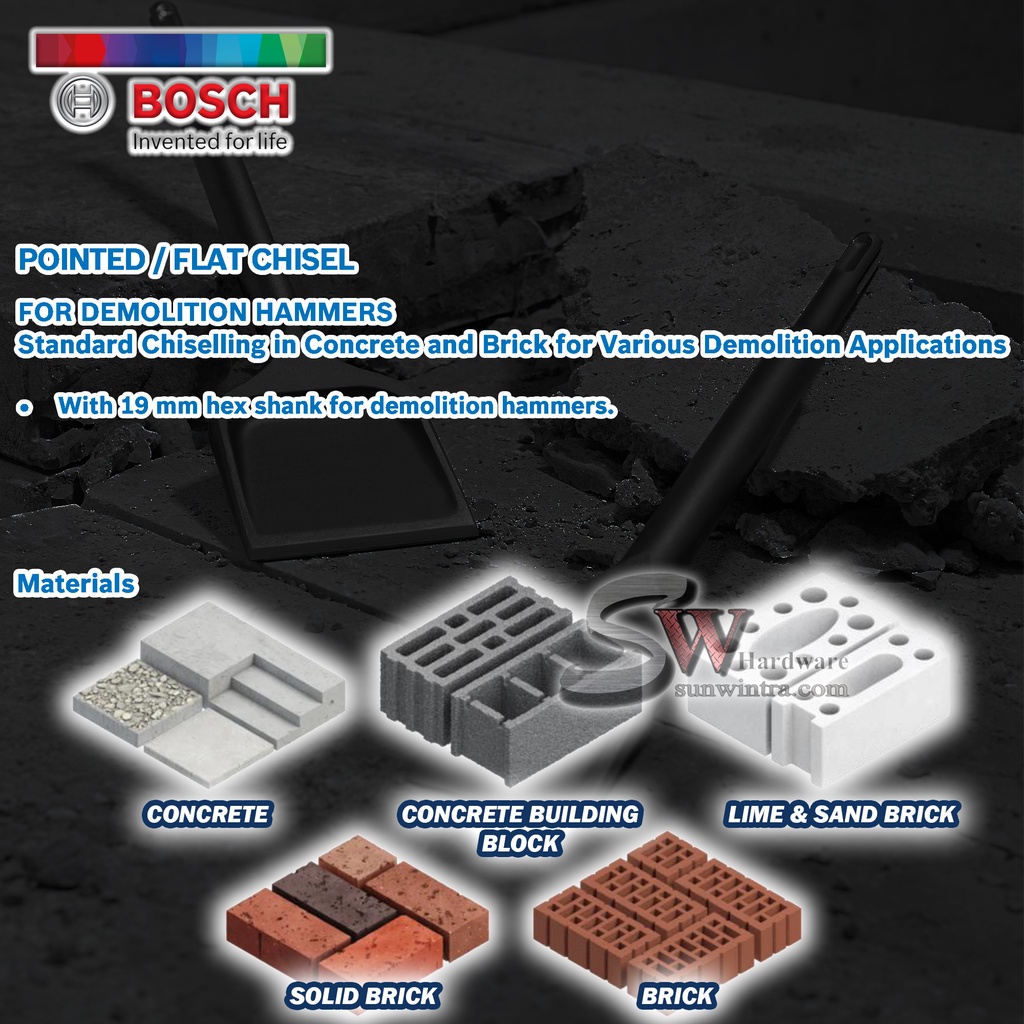 BOSCH 19MM HEX SHANK POINTED CHISEL / FLAT CHISEL 17MM X 280MM #2608684774 #2608684775 FOR DEMOLITION HAMMERS GSH500