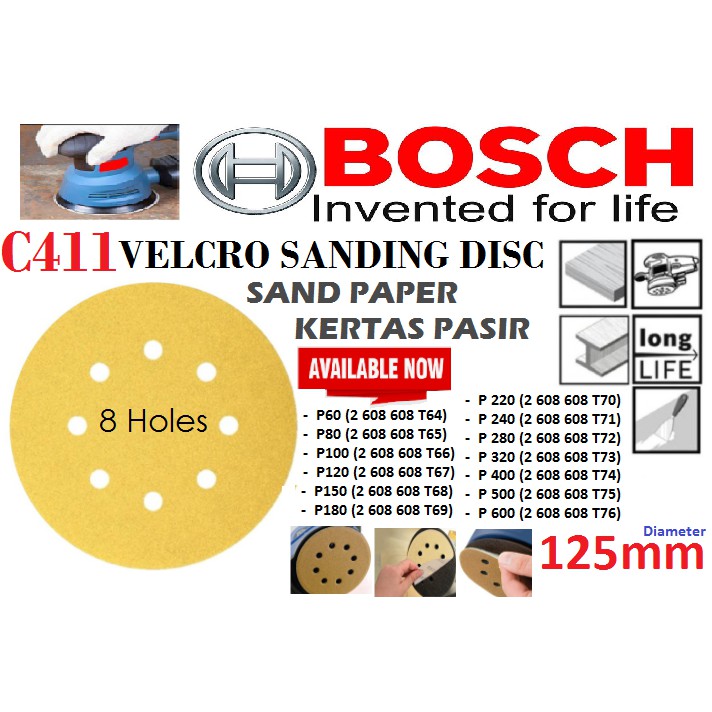 BOSCH C411 VELCRO SANDING DISC (SAND PAPER / KERTAS PASIR) - 8 HOLES & 125mm (WATERPROOF)