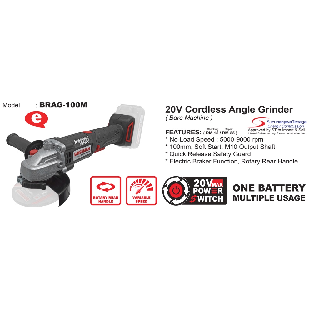BOSSMAN 20V Cordless Angle Grinder Brushless Motor Bare Machine Cutter (4")(BRAG-100M / BRAG100M) - Bare Machine