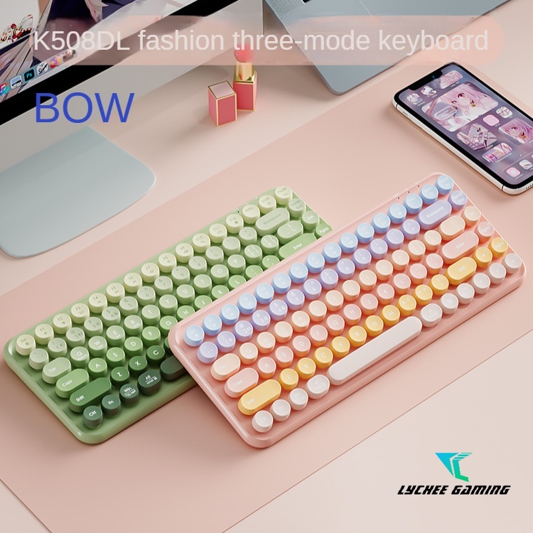 BOW Dual Mode Bluetooth Keyboard and Mouse Set Retro Round keycap 2.4g USB Wireless Laptop Phone Computer girl and boy Office Vintage Punk Candy Pink Matcha Green Gradient