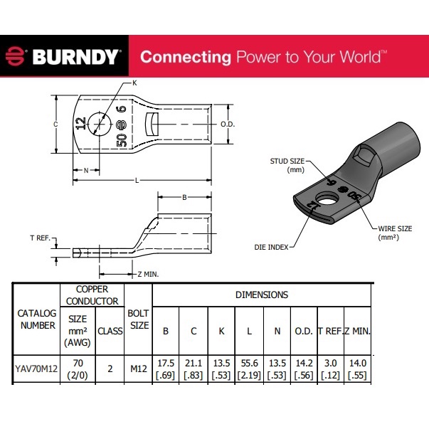 BURNDY YAV70M12 Compression Terminal/Cable Lug (For 70mmsq cable)(Bolt Size:M12)