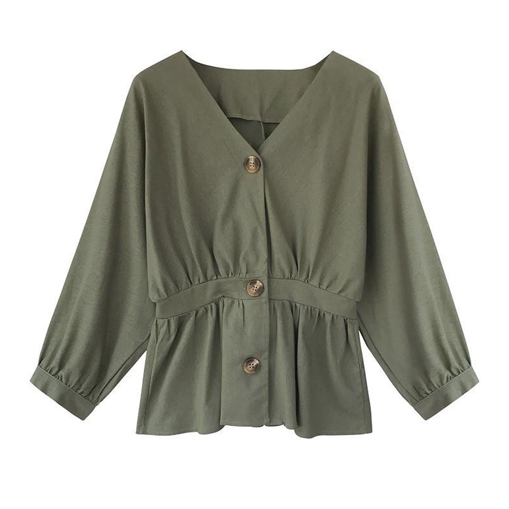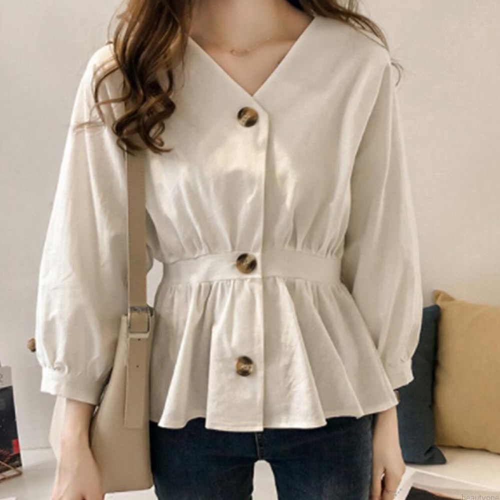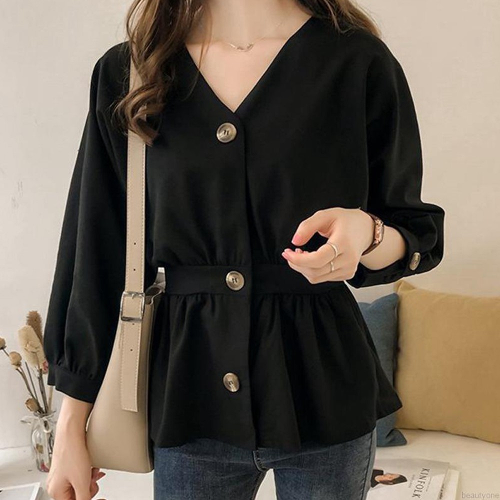 Baju Kemeja Perempuan Blouse Women Long Sleeve Shirt Plain Button Slim Casual Comfortable V Neck
