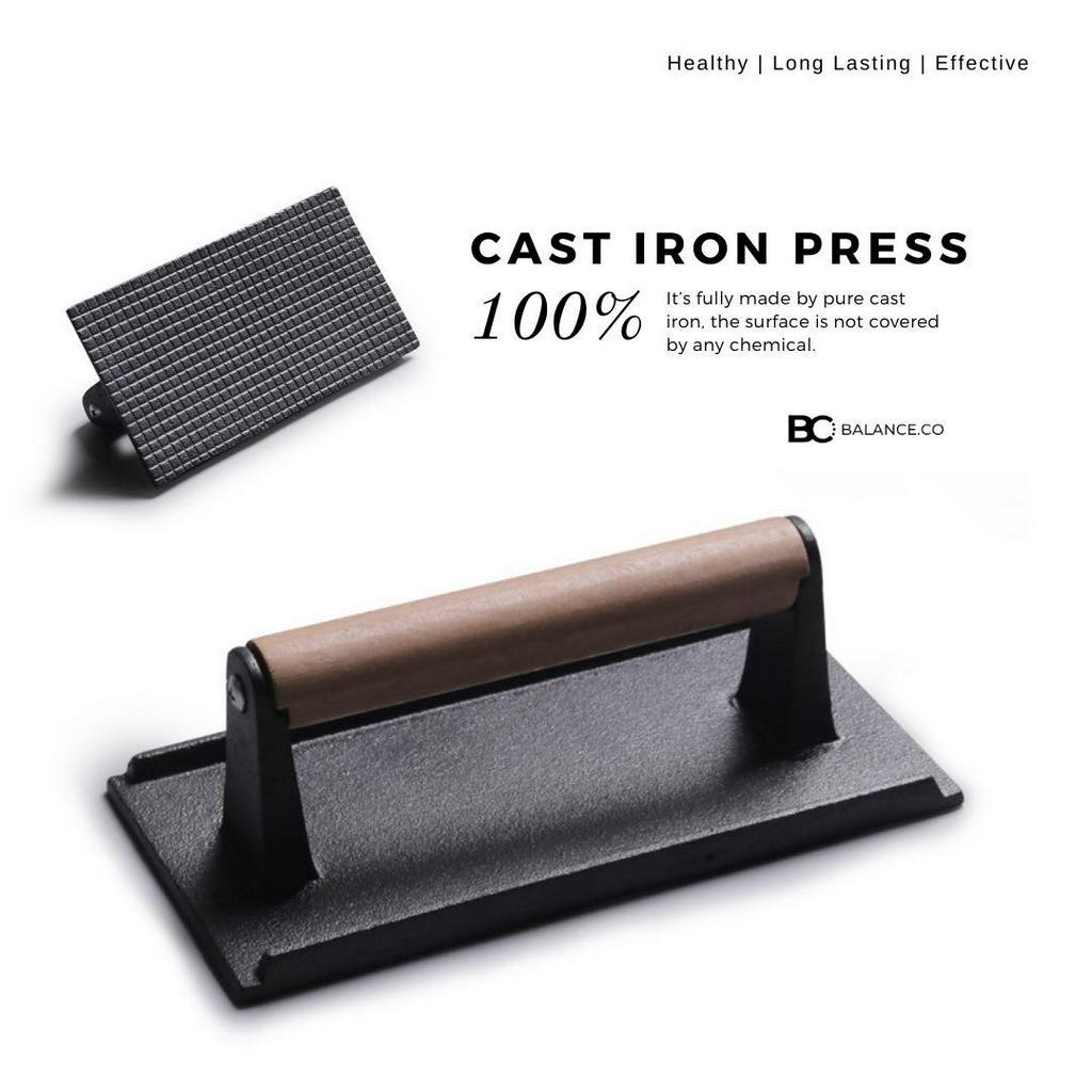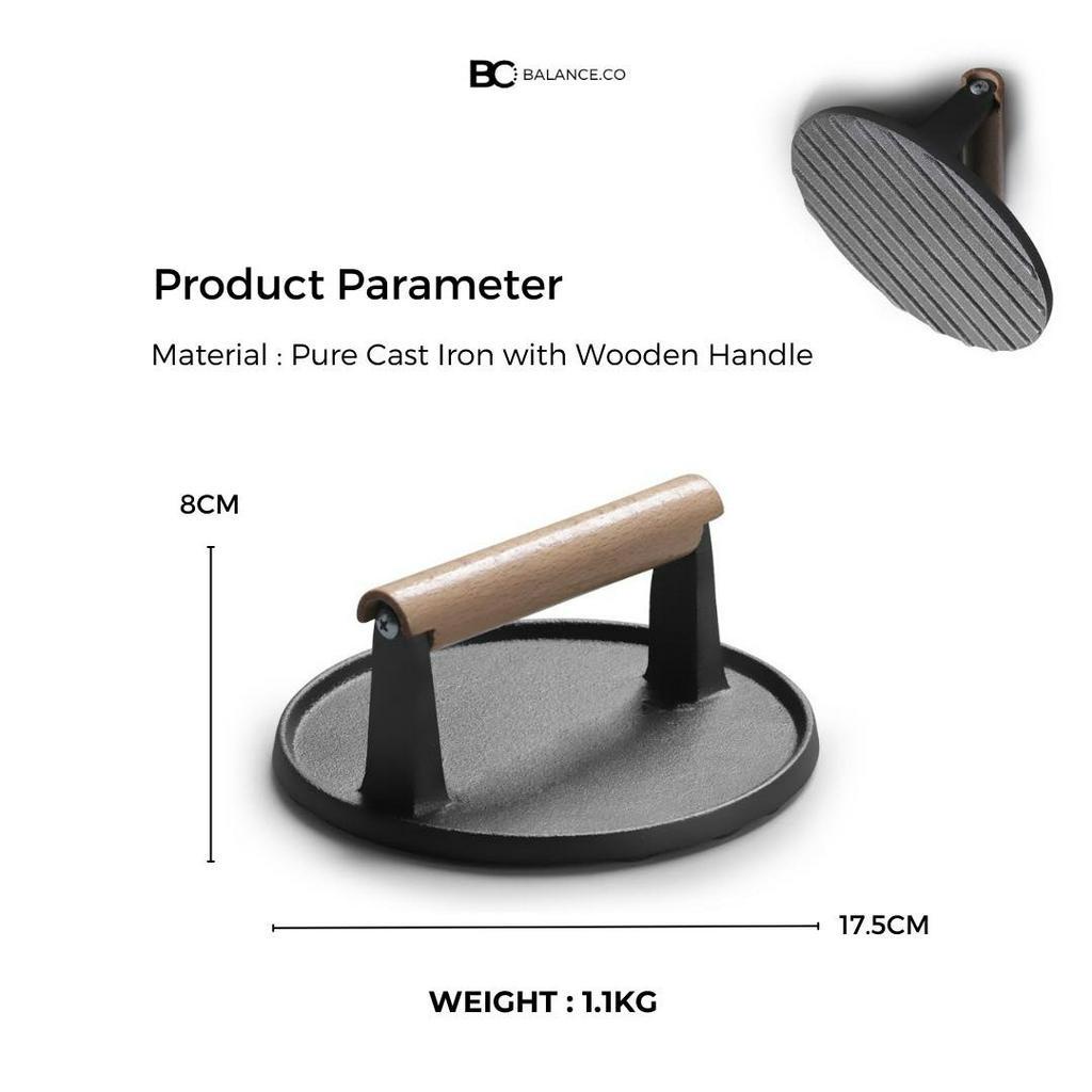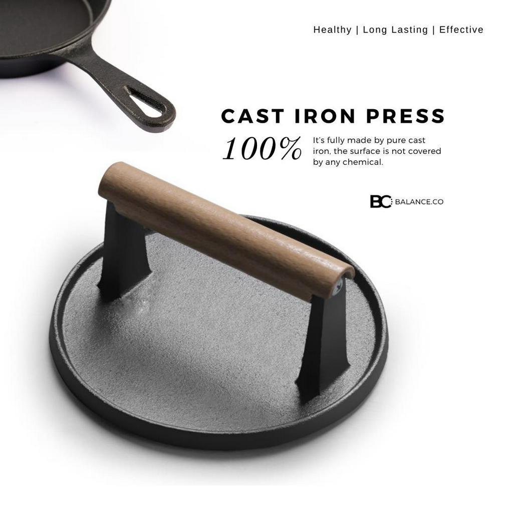 Balance.co Heavy Duty Cast Iron Grill Steak Press with Wood Handle Meat Burger Smasher BBQ Accessory