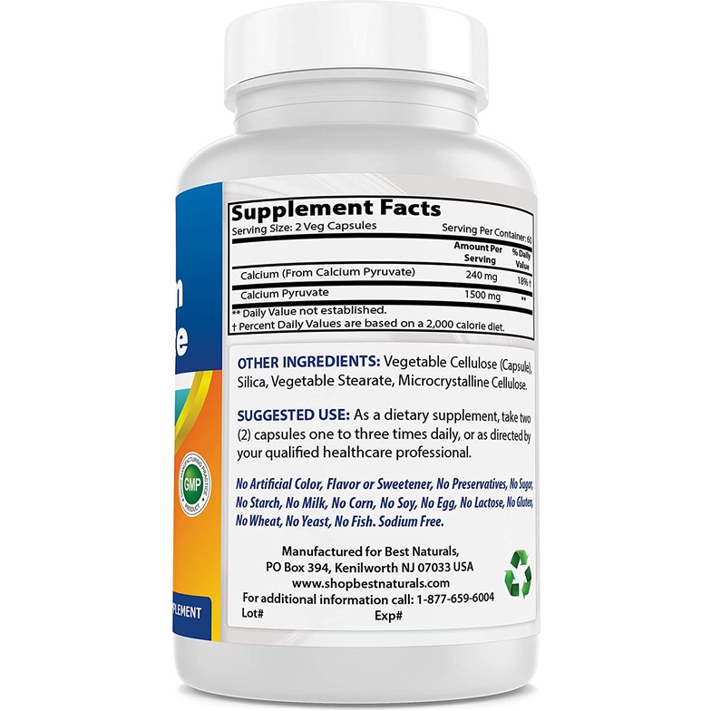 Best Naturals Calcium Pyruvate Fat-Burning Formula for Thighs, 750 mg 120 Capsules - Calcium pyruvate for Weight Loss