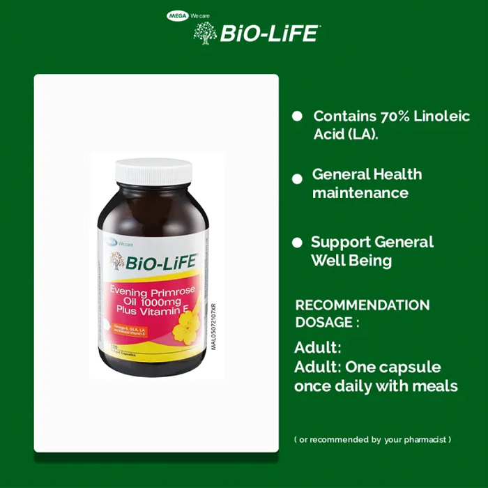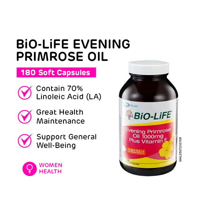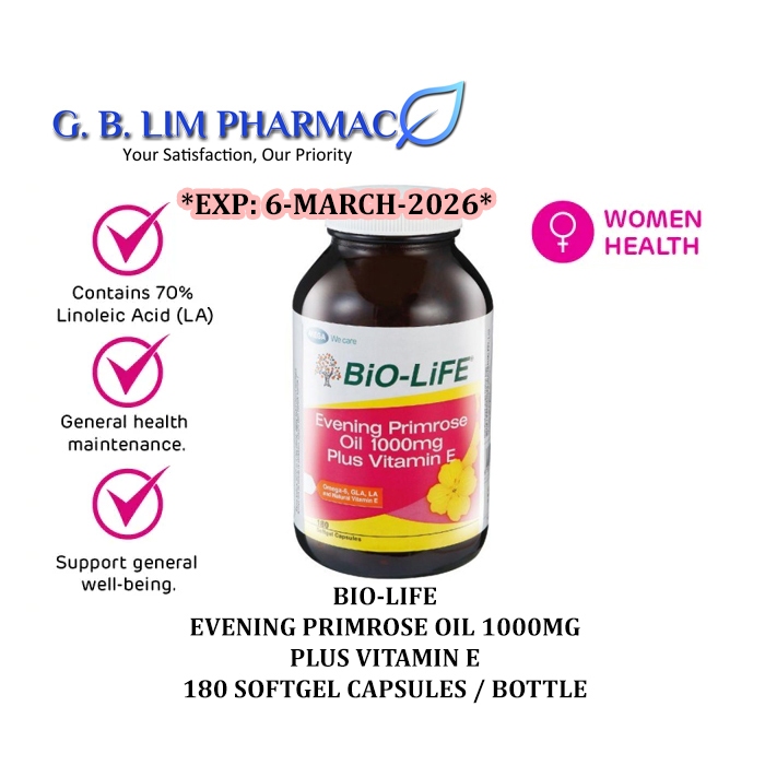 (EXP: 6-MAR-2026) Bio-Life Evening Primrose Oil EPO 1000MG Plus Vitamin E 180 Capsules One Bottle